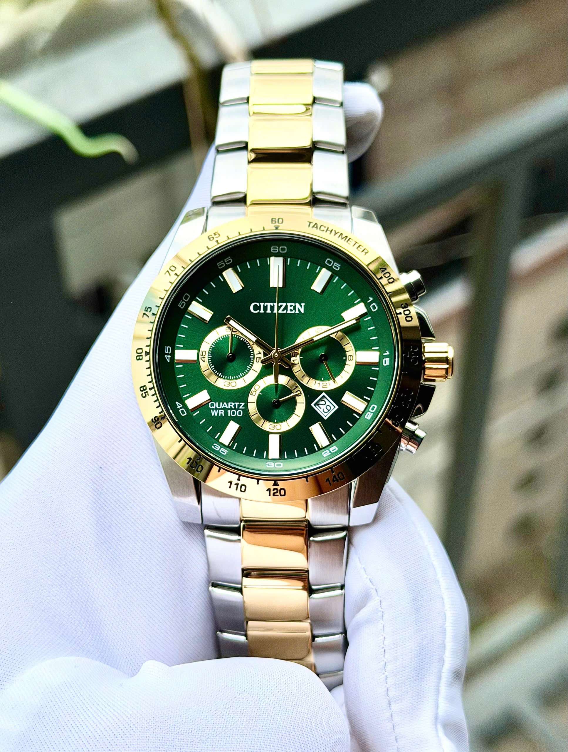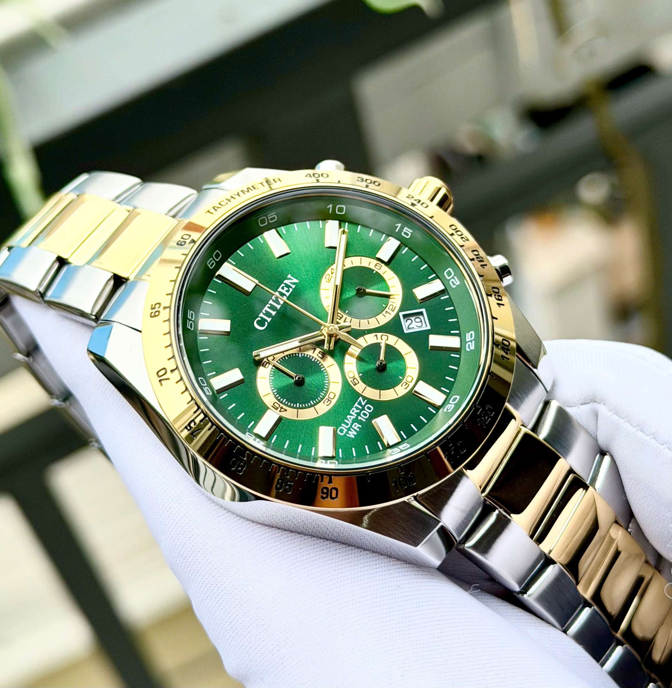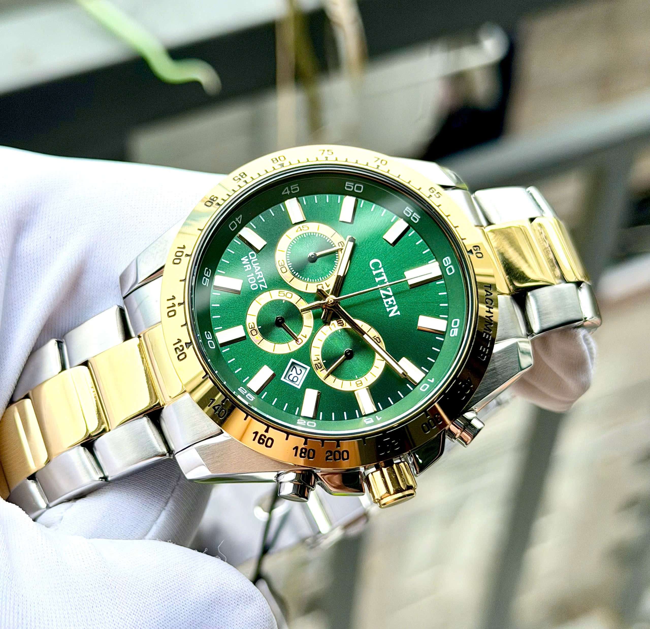 - *Thiết kế:* Chronograph mạnh mẽ, mặt số xanh lá nổi bật, dây thép không gỉ demi trắng vàng sang trọng