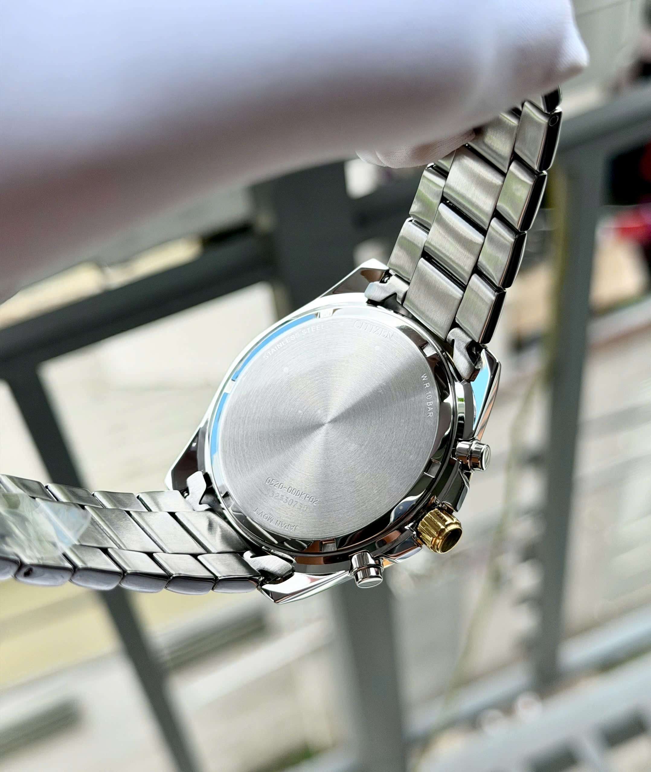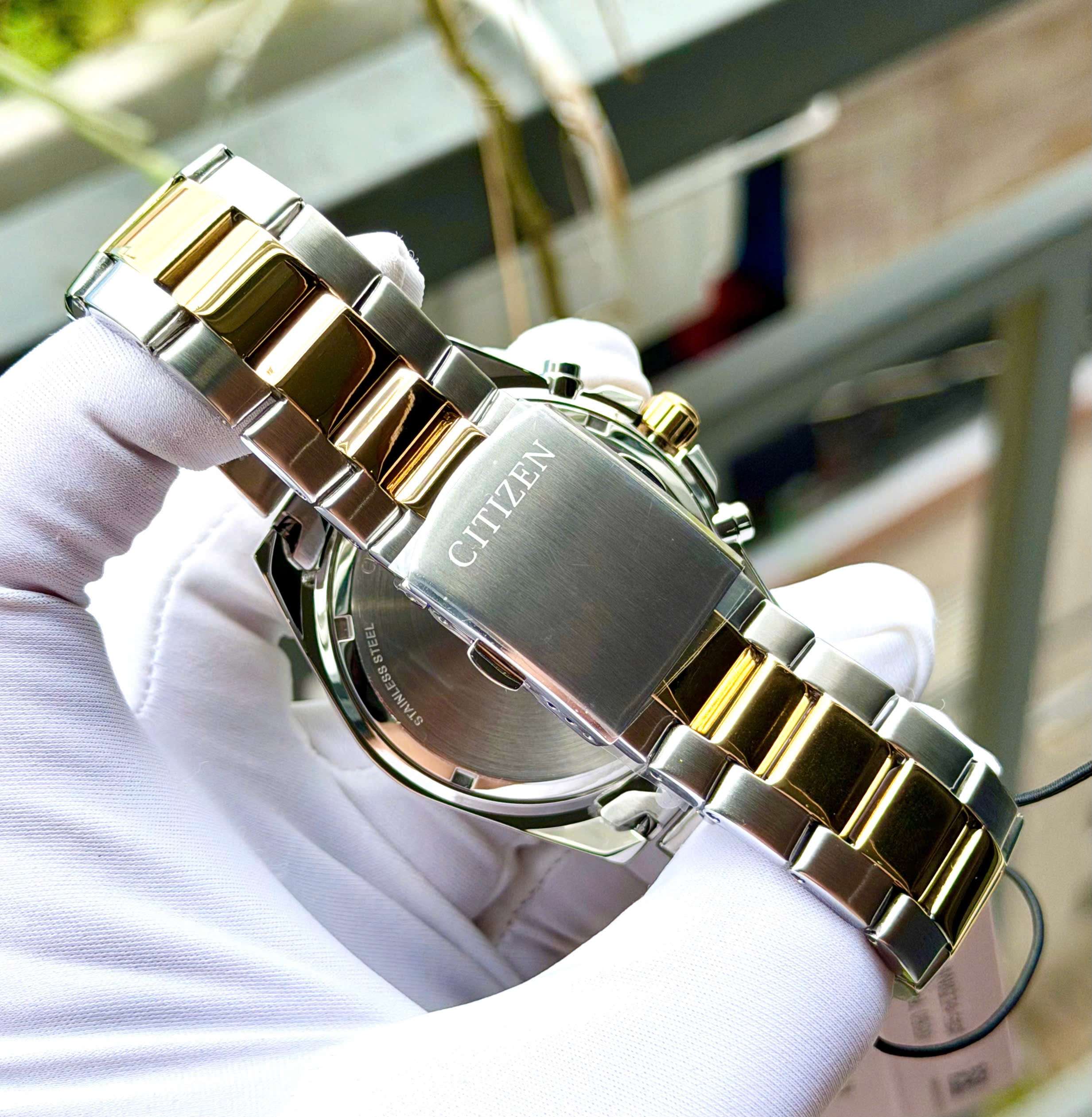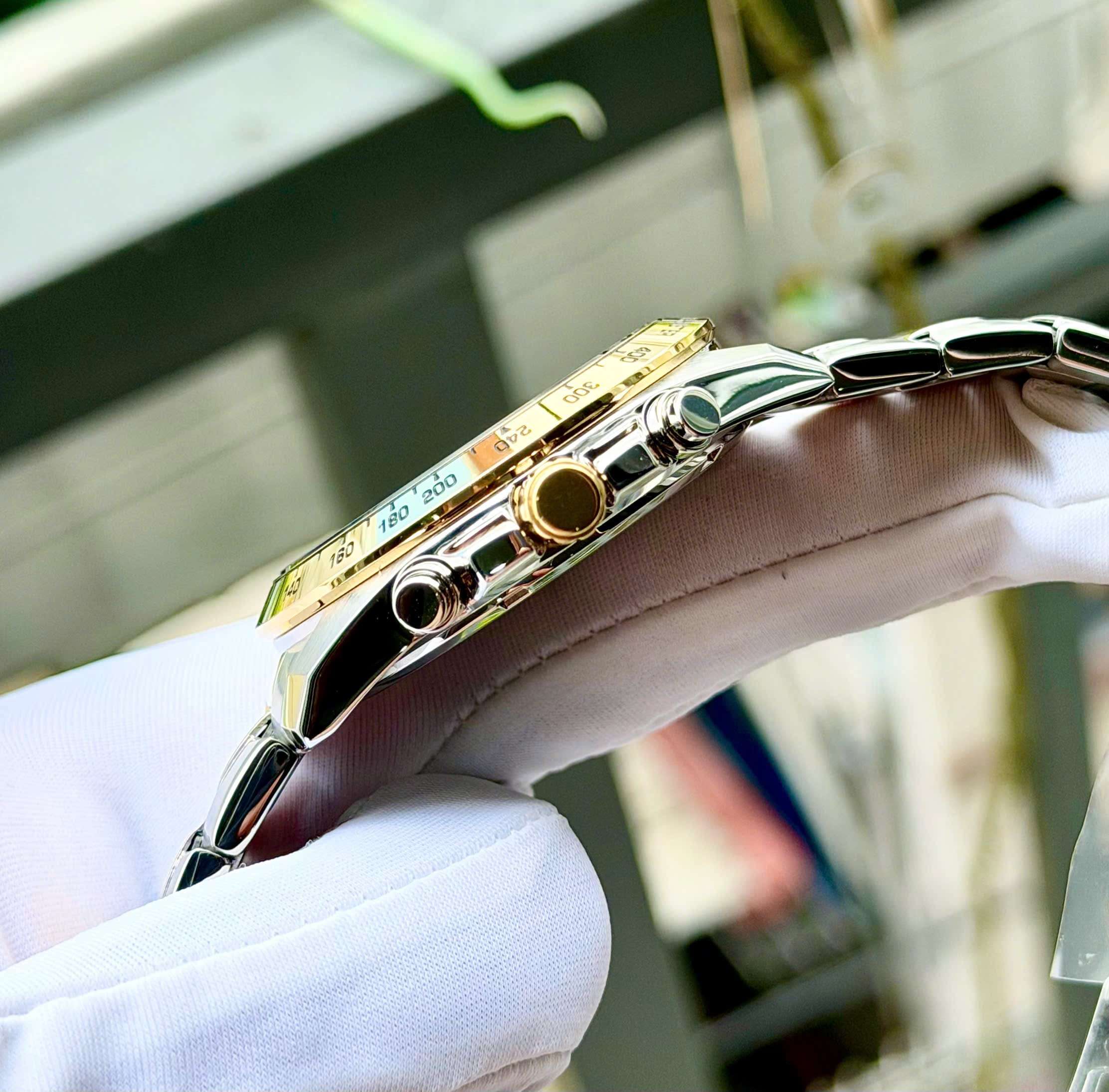 - *Thiết kế:* Chronograph mạnh mẽ, mặt số xanh lá nổi bật, dây thép không gỉ demi trắng vàng sang trọng