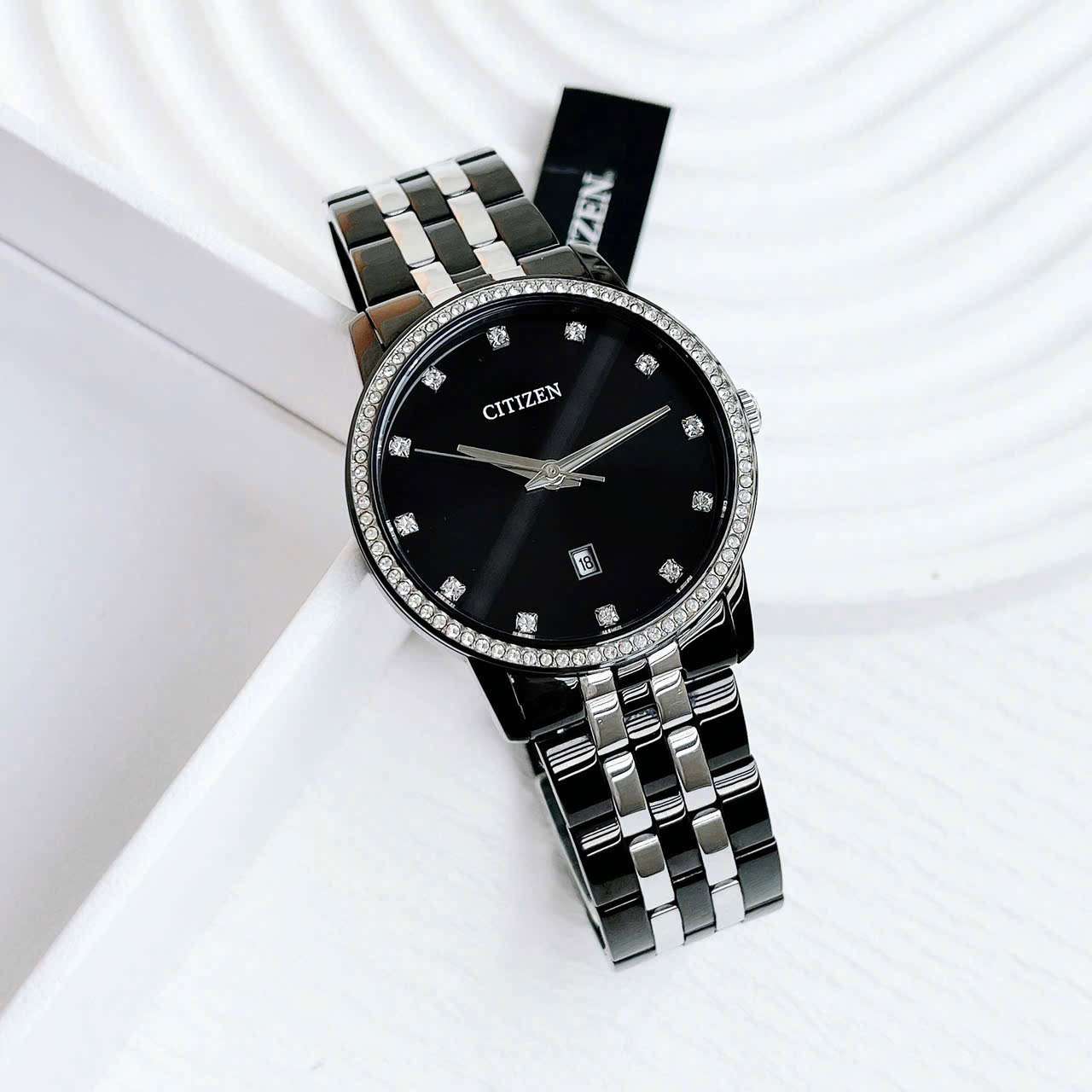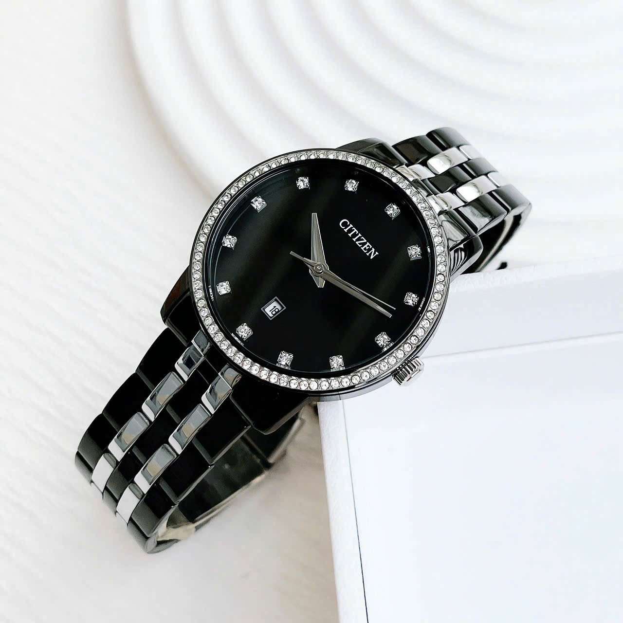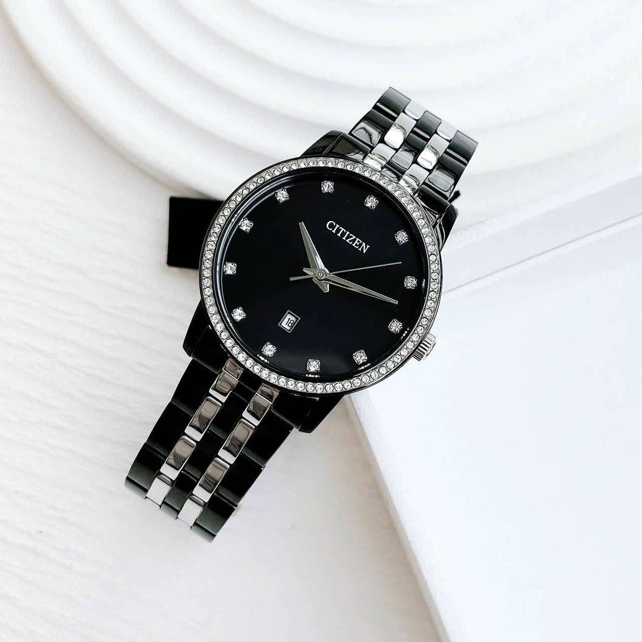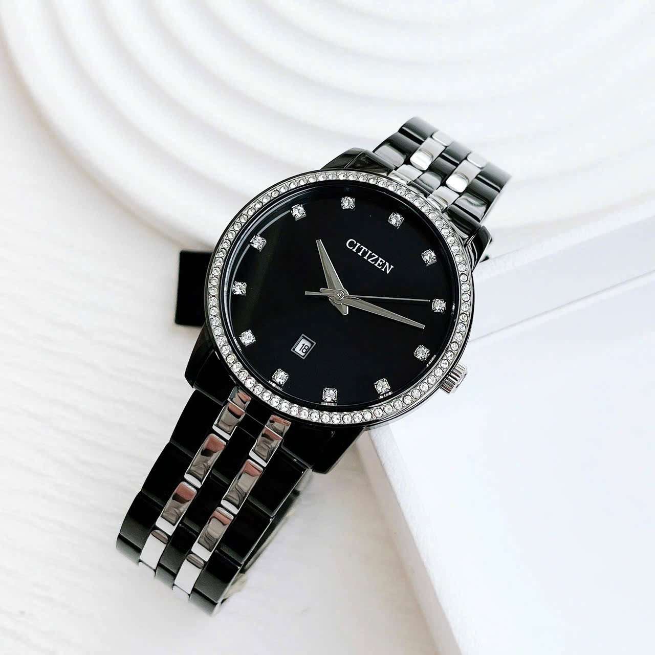 - Viền kim cương nhân tạo trên mặt đồng hồ làm tăng thêm vẻ đẹp tinh tế và quý phái