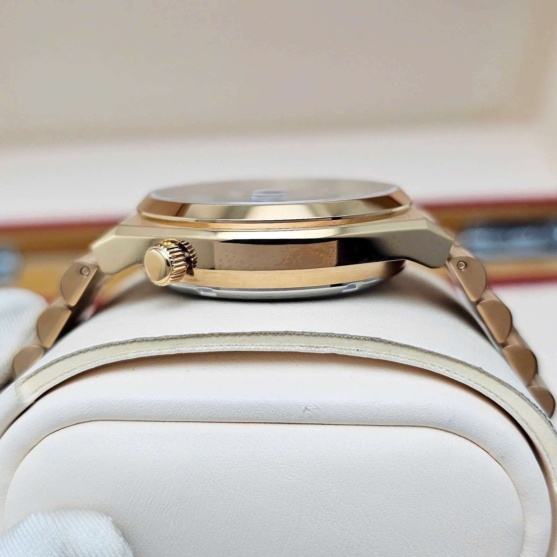 - *Mặt số:* Xanh với họa tiết Guilloché tinh xảo, kết hợp cọc số dạ quang và ô lịch phóng đại tại vị trí 3 giờ