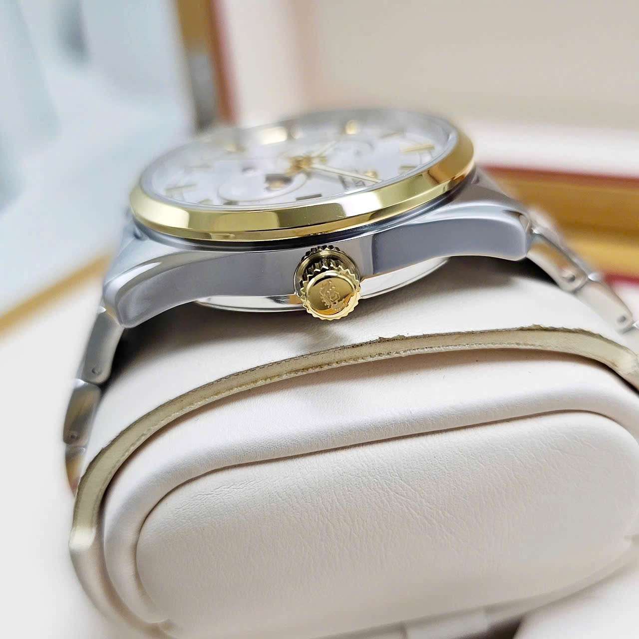 Phiên bản mới nhất 2026 của dòng Stretto Day & Night đã có mặt với thiết kế dây và vỏ thép demi vàng sang trọng, kết hợp với mặt số trắng thanh lịch. Đồng hồ này không chỉ đẹp mắt mà còn tích hợp nhiều tính năng hữu ích như kim dạ quang, ô lịch ngày, lịch thứ và lịch ngày & đêm đối xứng nhau.