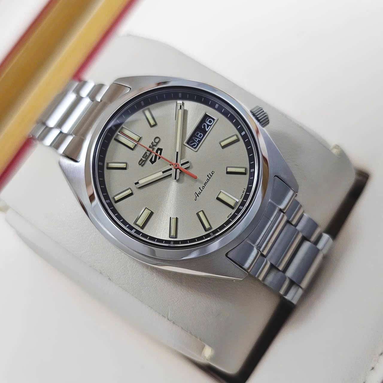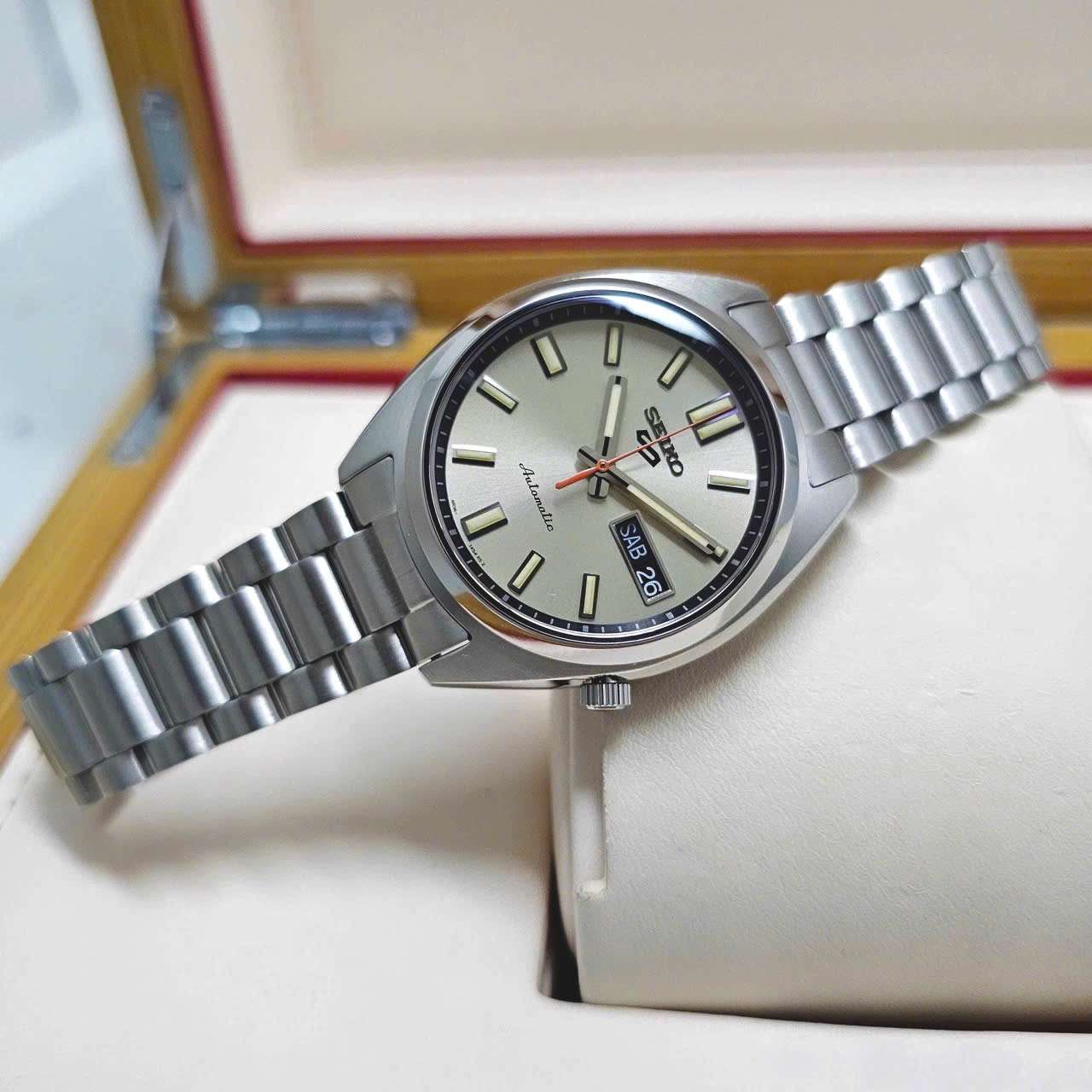 Chiếc Seiko 5 Automatic này mang thiết kế tinh tế với mặt số màu champagne sang trọng kết hợp cùng kim và cọc số phủ dạ quang có thể xem giờ trong điều kiện thiếu ánh sáng.