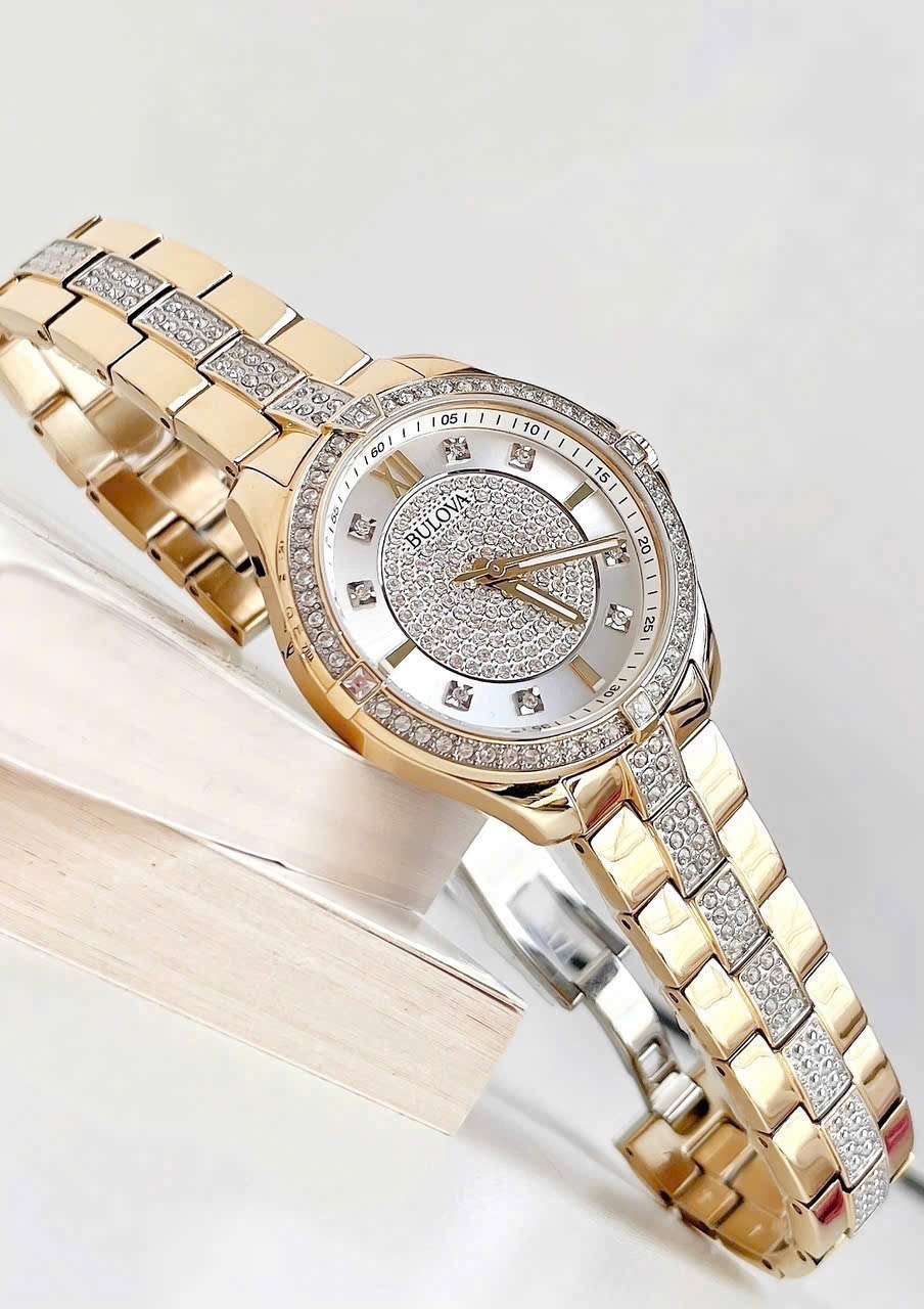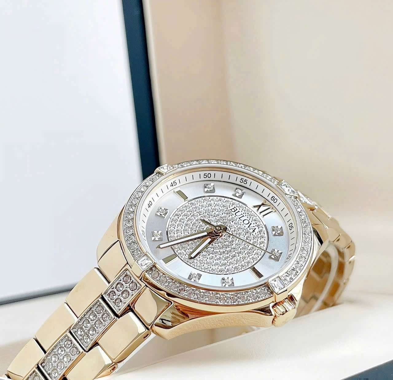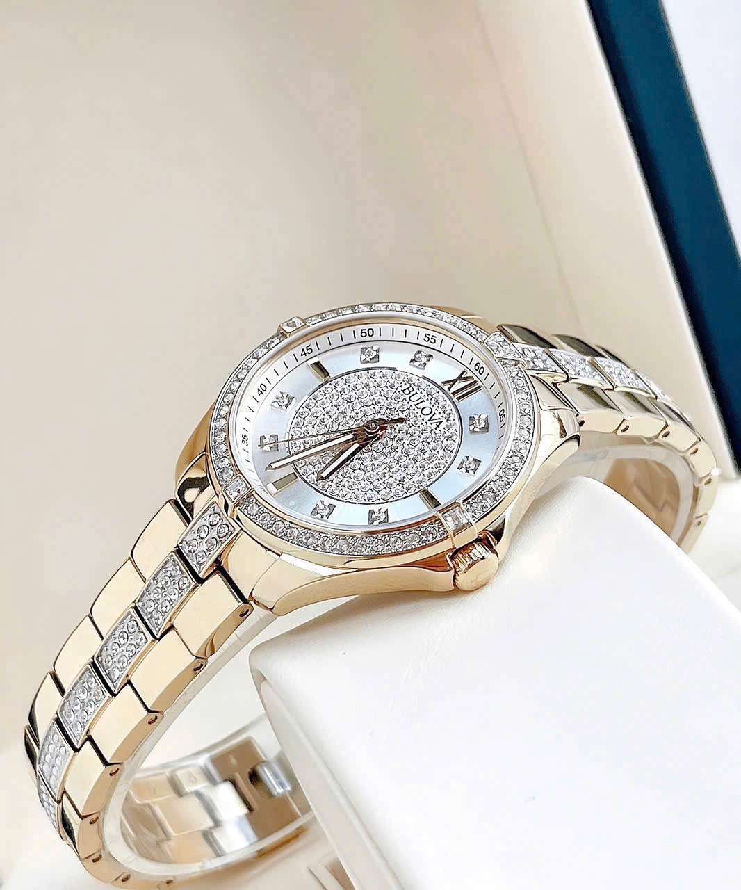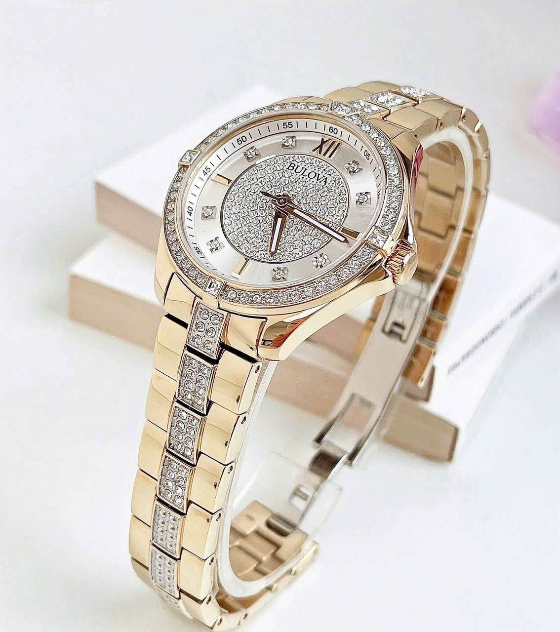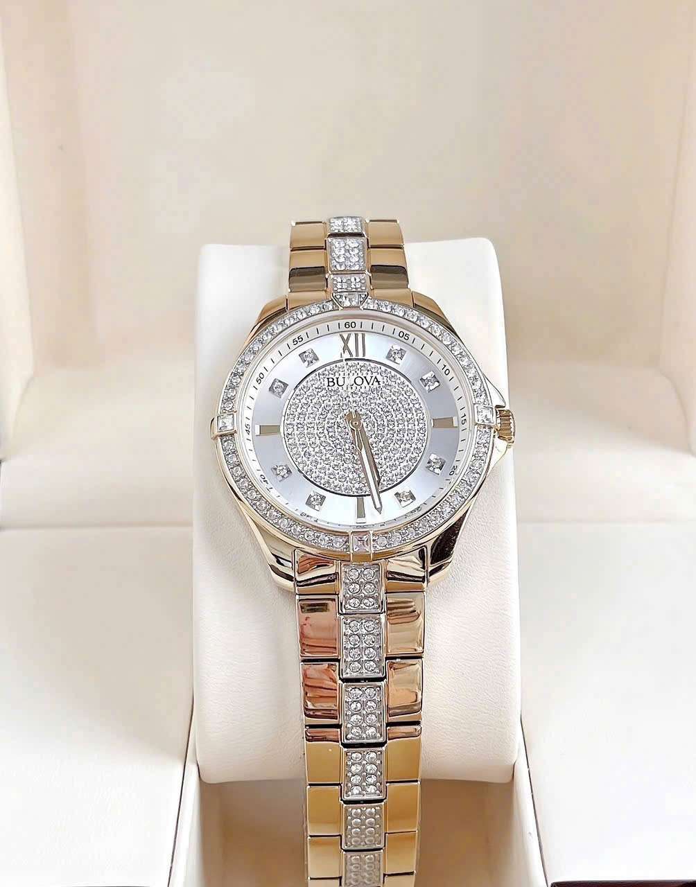 Bulova 98L228 là mẫu nữ demi gold siêu nổi bật, mặt full đá Swarovski sáng lấp lánh, 4 cọc giờ đính kim cương cực sang.