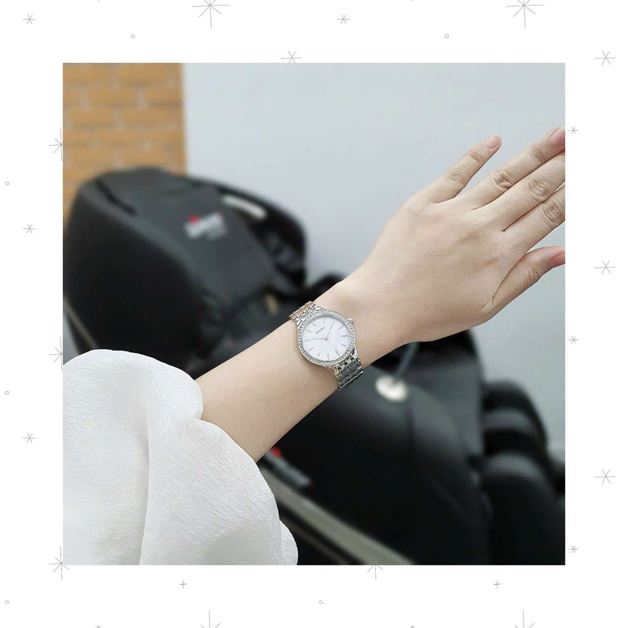 - *Viền mặt và dây:* Gắn đá siêu sáng