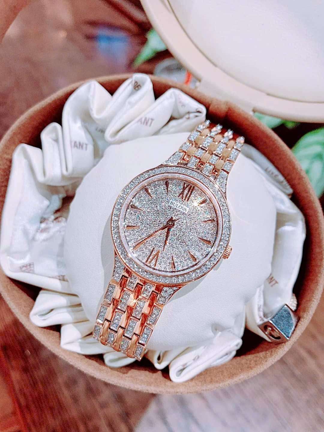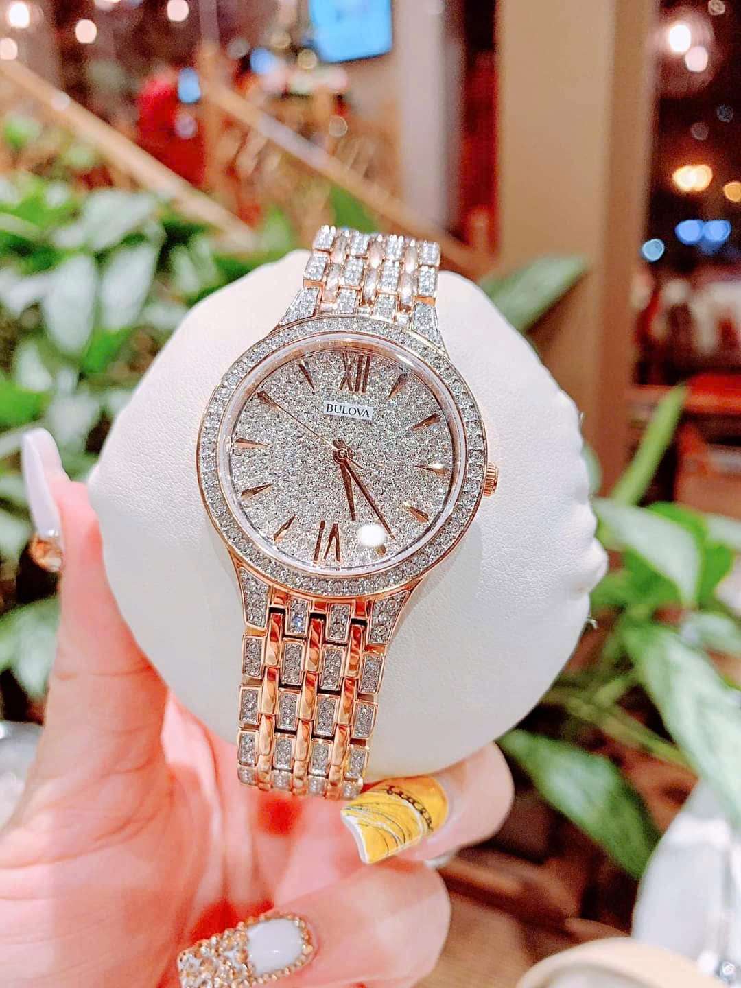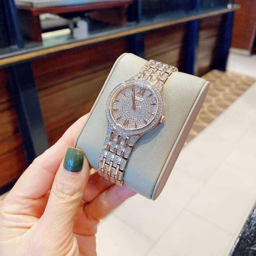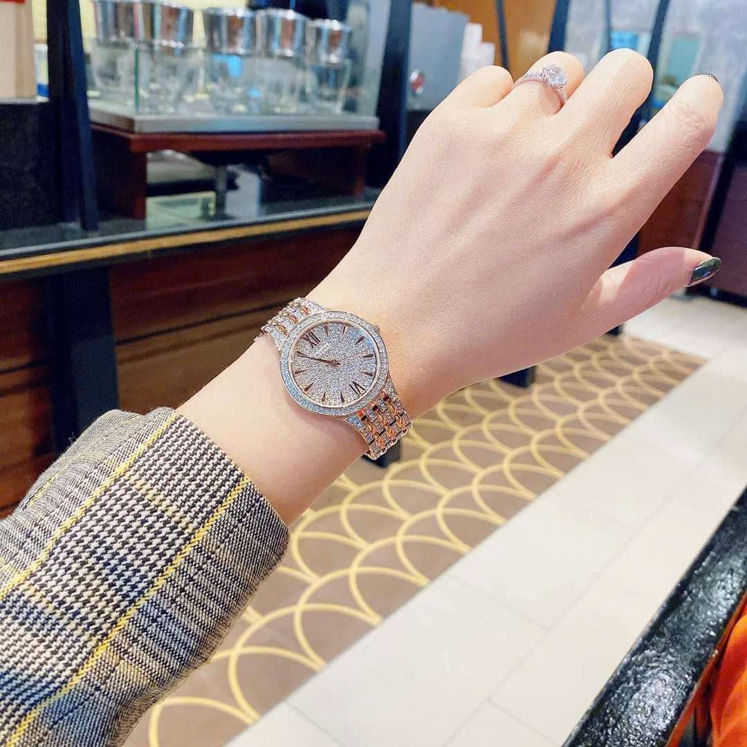 🔹 Máy Quartz JAPAN Thiết kế sang trọng với 440 viên đá Swarovski thiên nhiên trên mặt, viền và dây đồng hồ