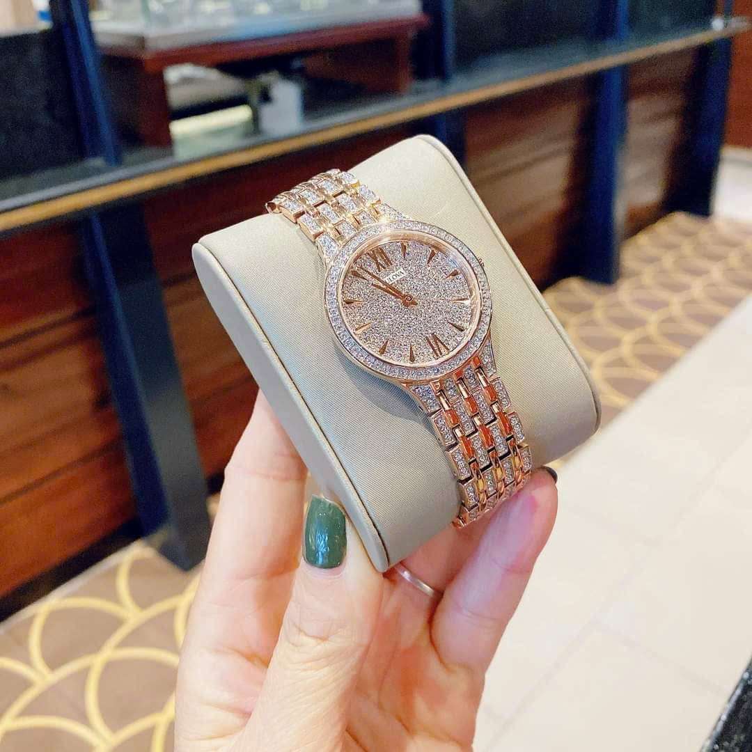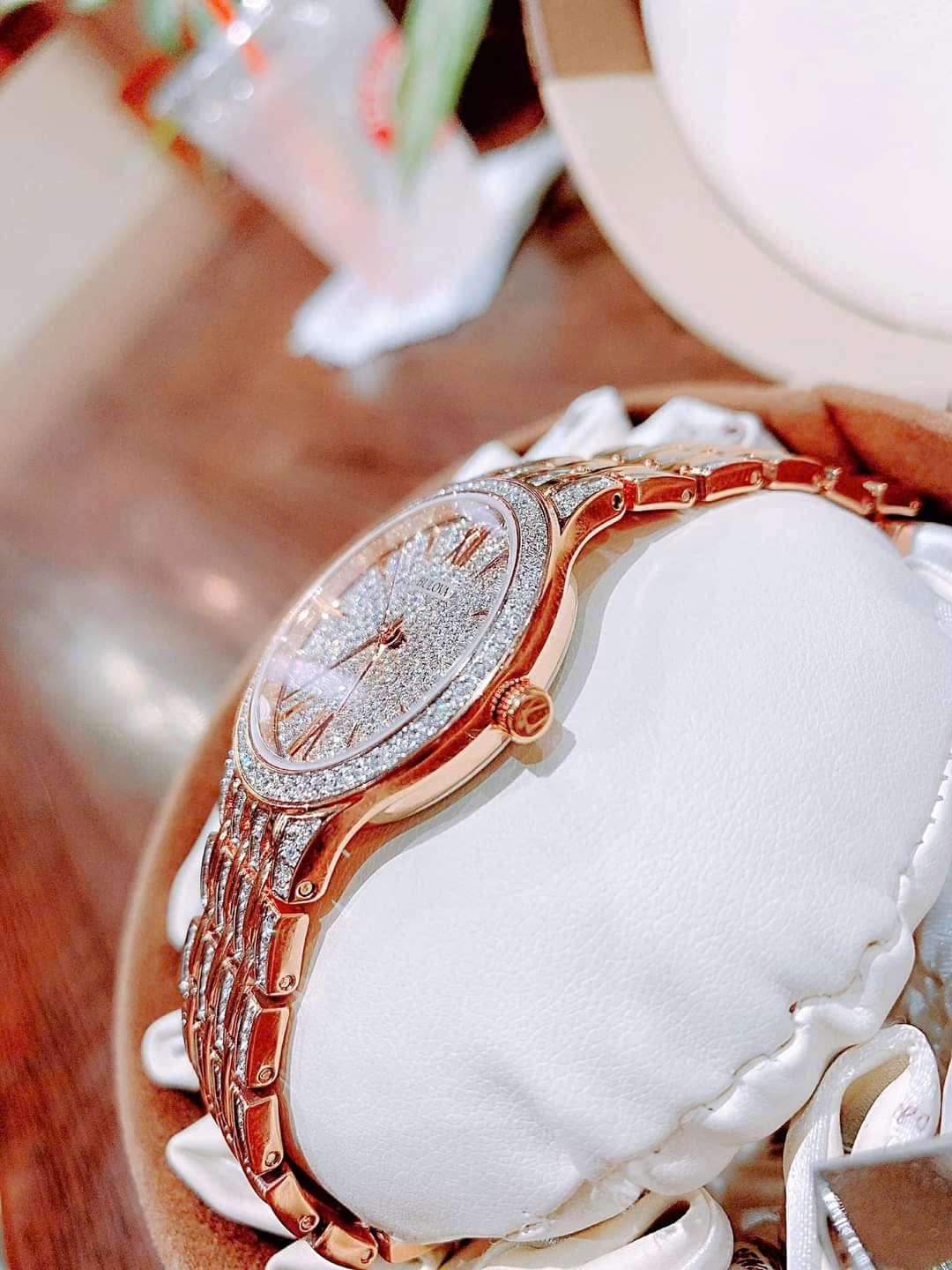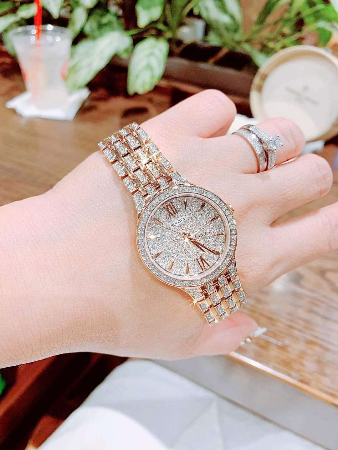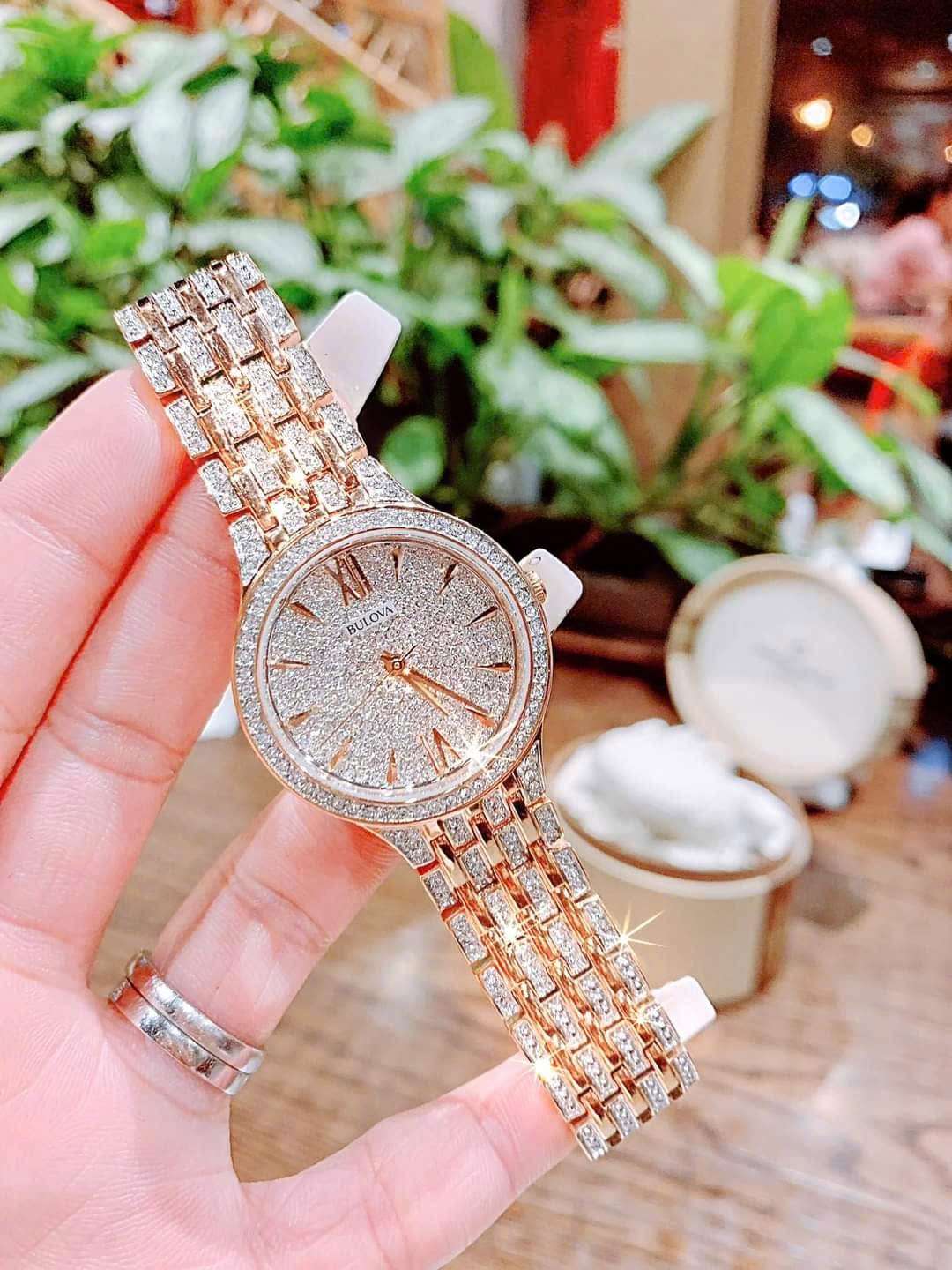 🔹 Máy Quartz JAPAN Thiết kế sang trọng với 440 viên đá Swarovski thiên nhiên trên mặt, viền và dây đồng hồ