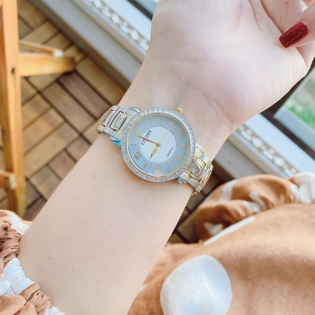 - *Thiết kế:* Mặt số xanh nhẹ nhàng, dây demi sang trọng, viền đính đá Swarovski ấn tượng