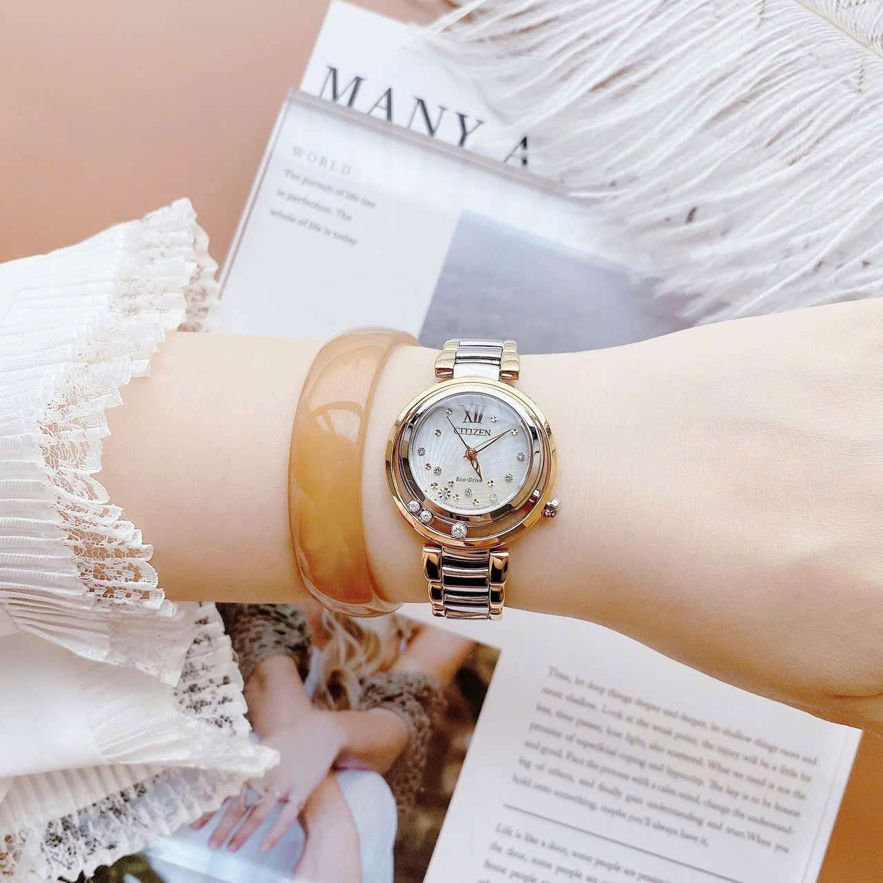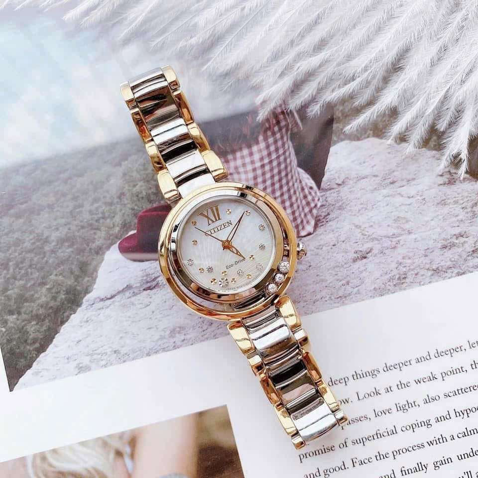 Đồng Hồ Nữ Citizen EM0324-58D Eco Drive Size 30 Demi Gold Sapphire Diamond