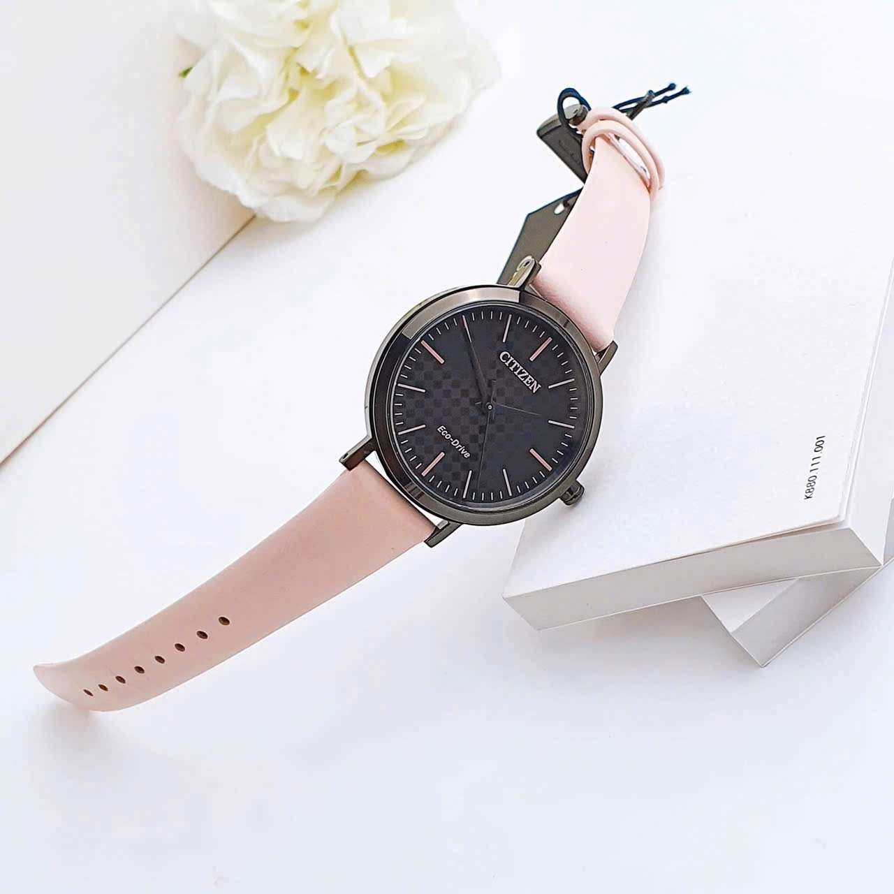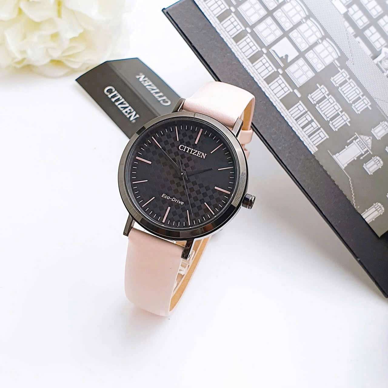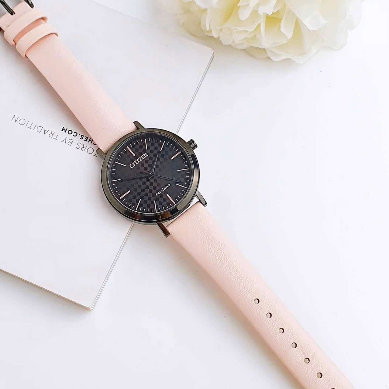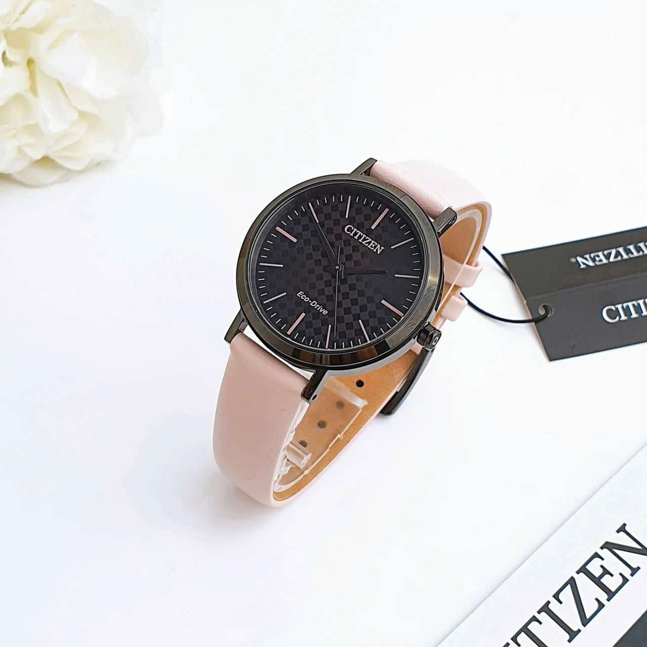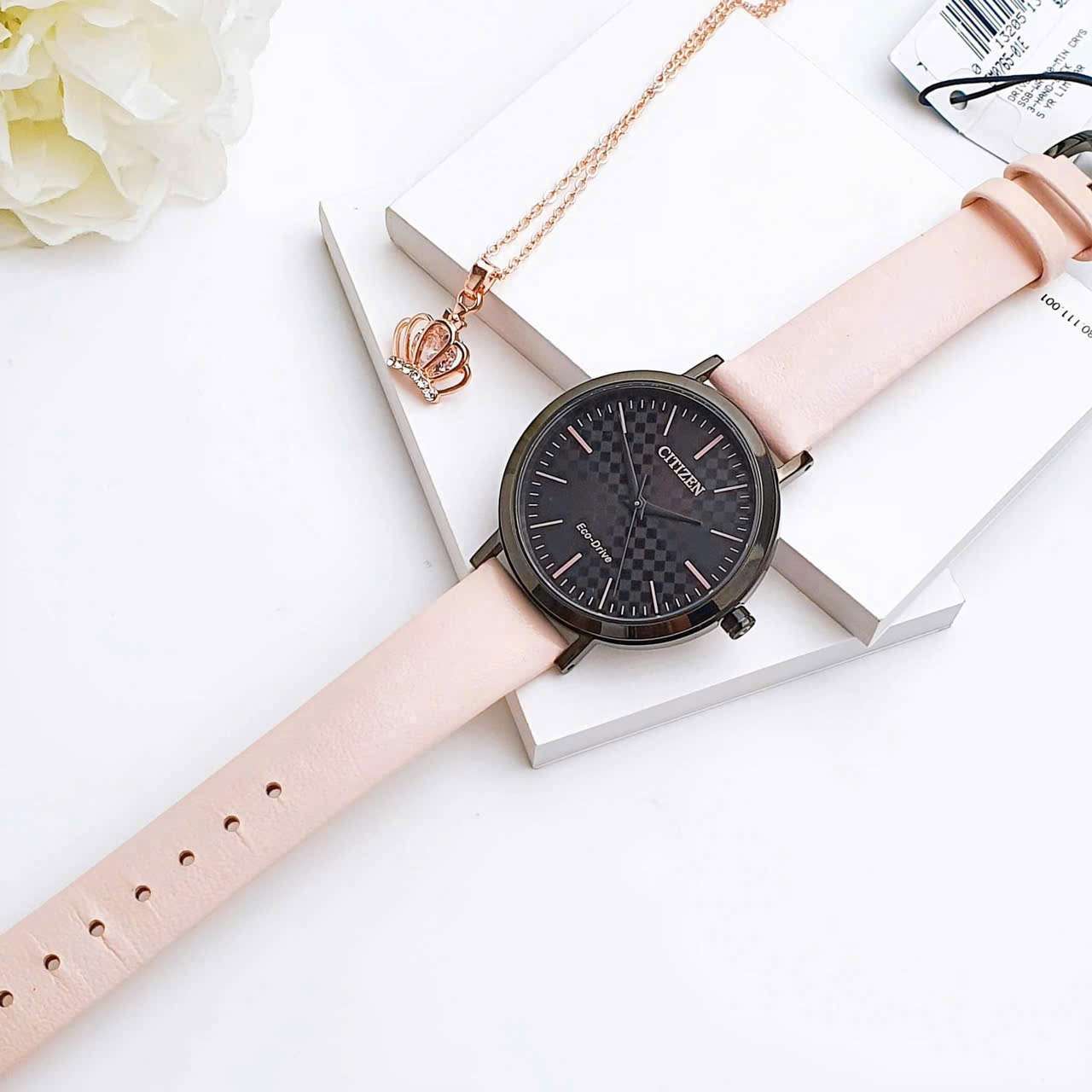 Đồng Hồ Nữ Citizen EM0765-01E Eco Drive Size 36 Mặt Đen Sọc Ca Rô