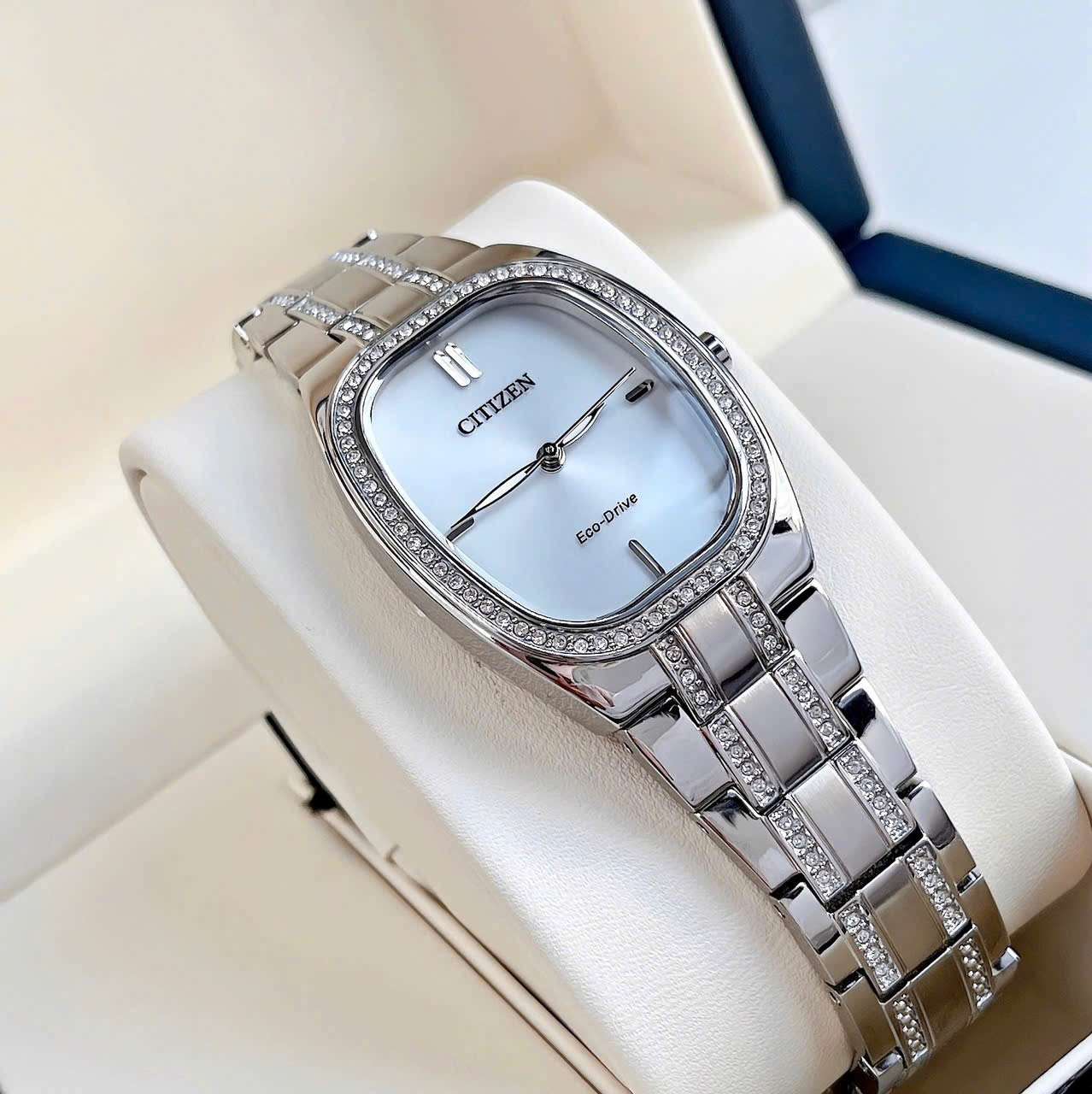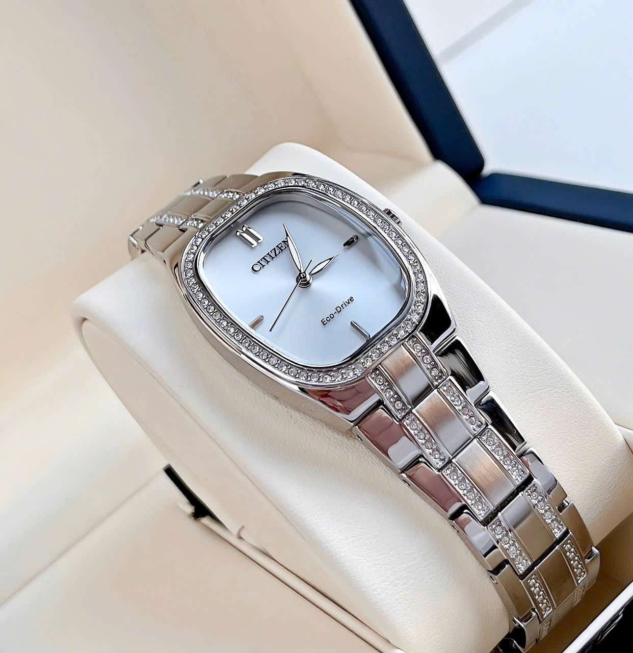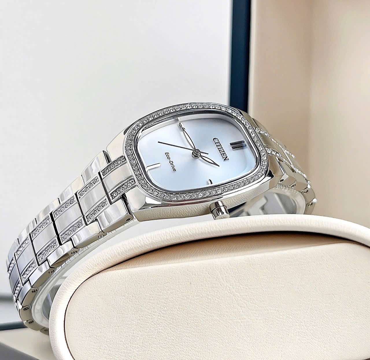 Đồng Hồ Nữ Citizen EM1080-55A Eco Drive Size 28 Silver Tone Mặt Chữ Nhật