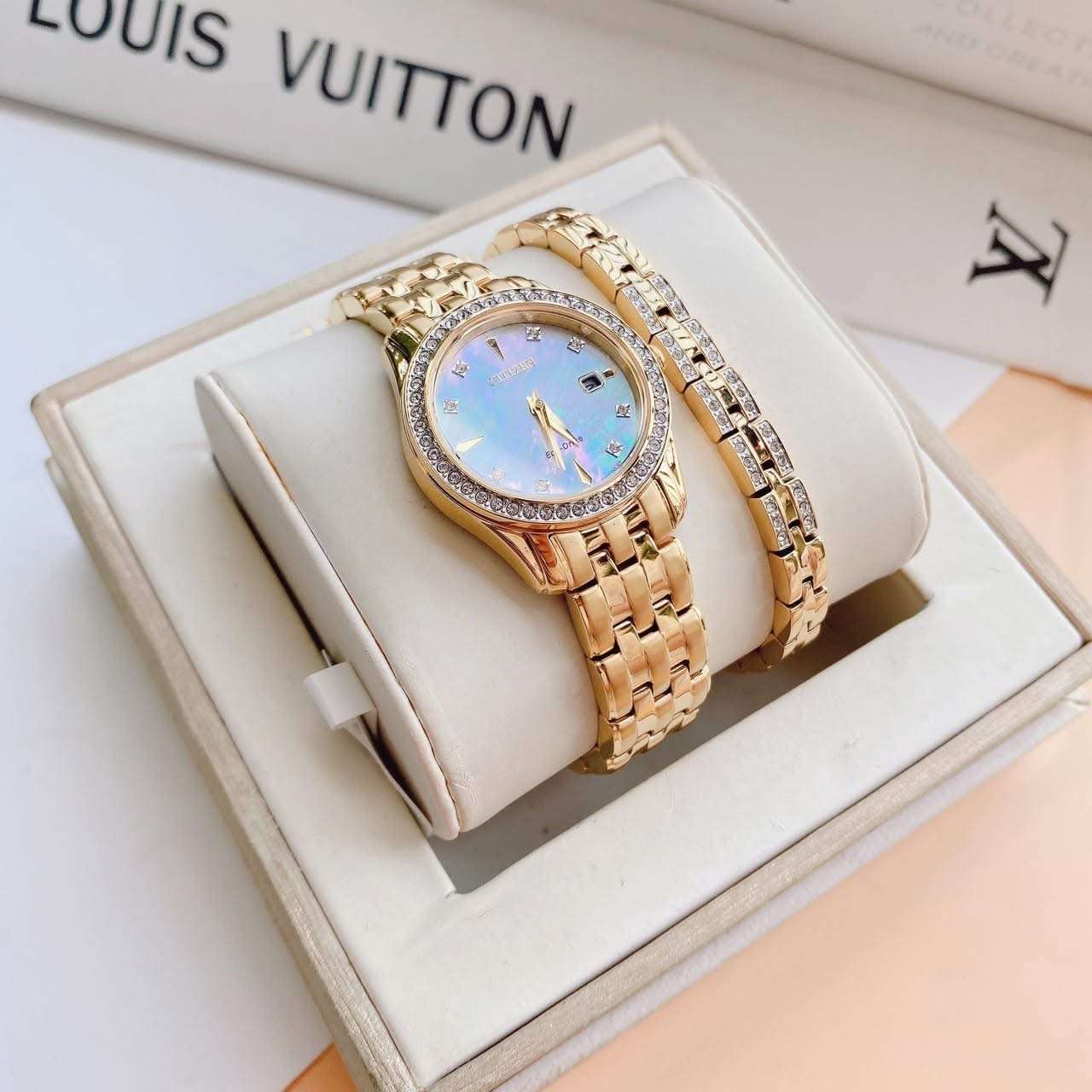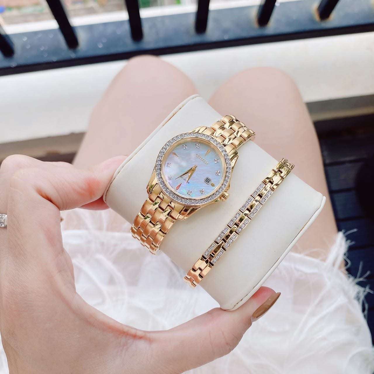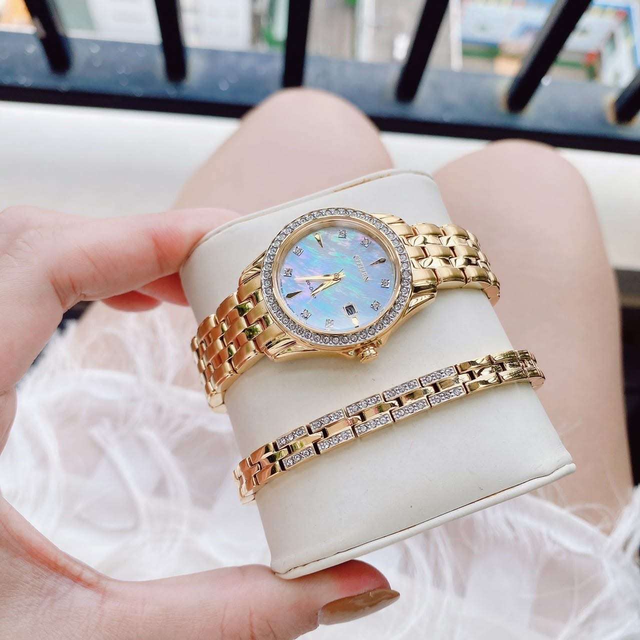- *Mặt số:* Khảm xà cừ, cọc số và viền đính pha lê