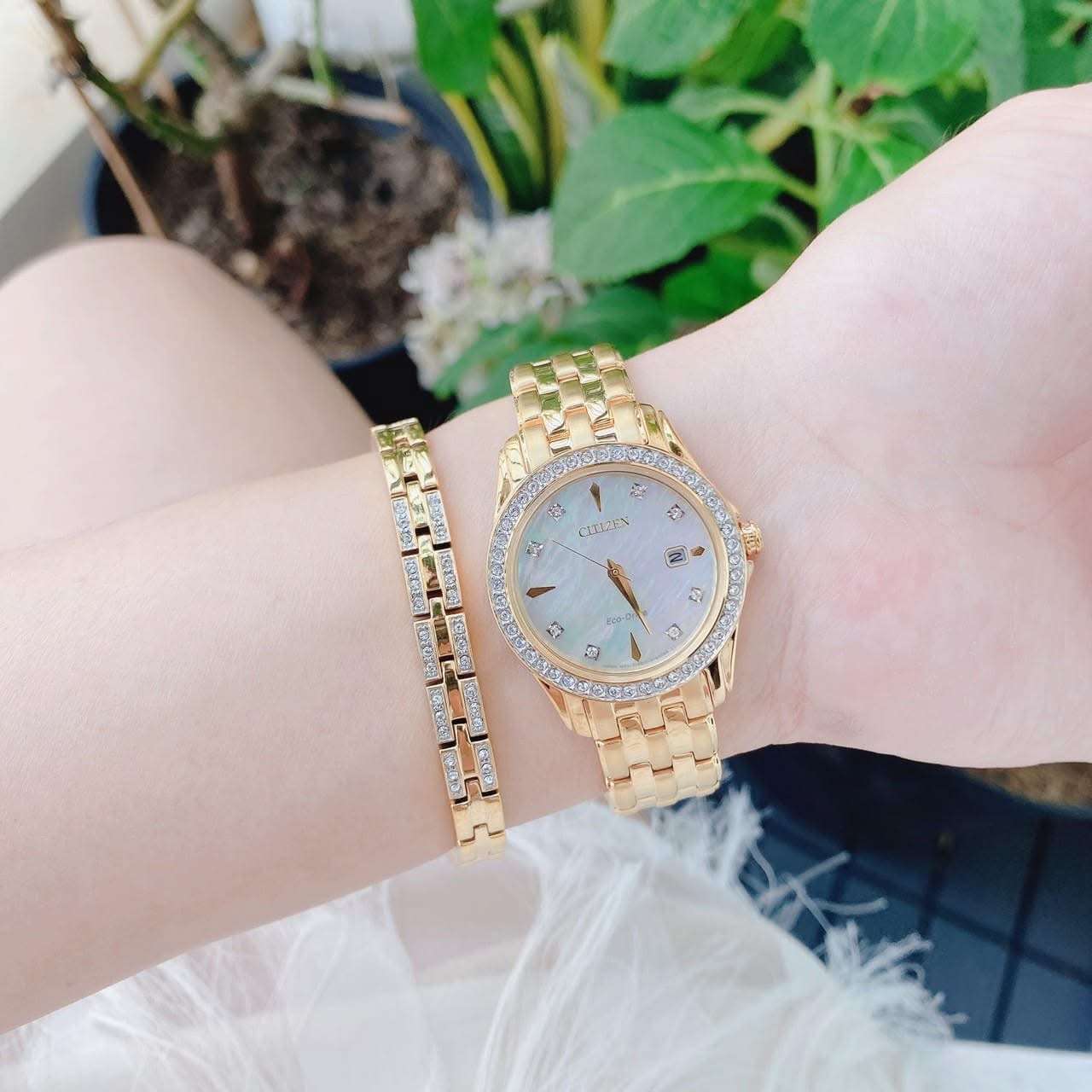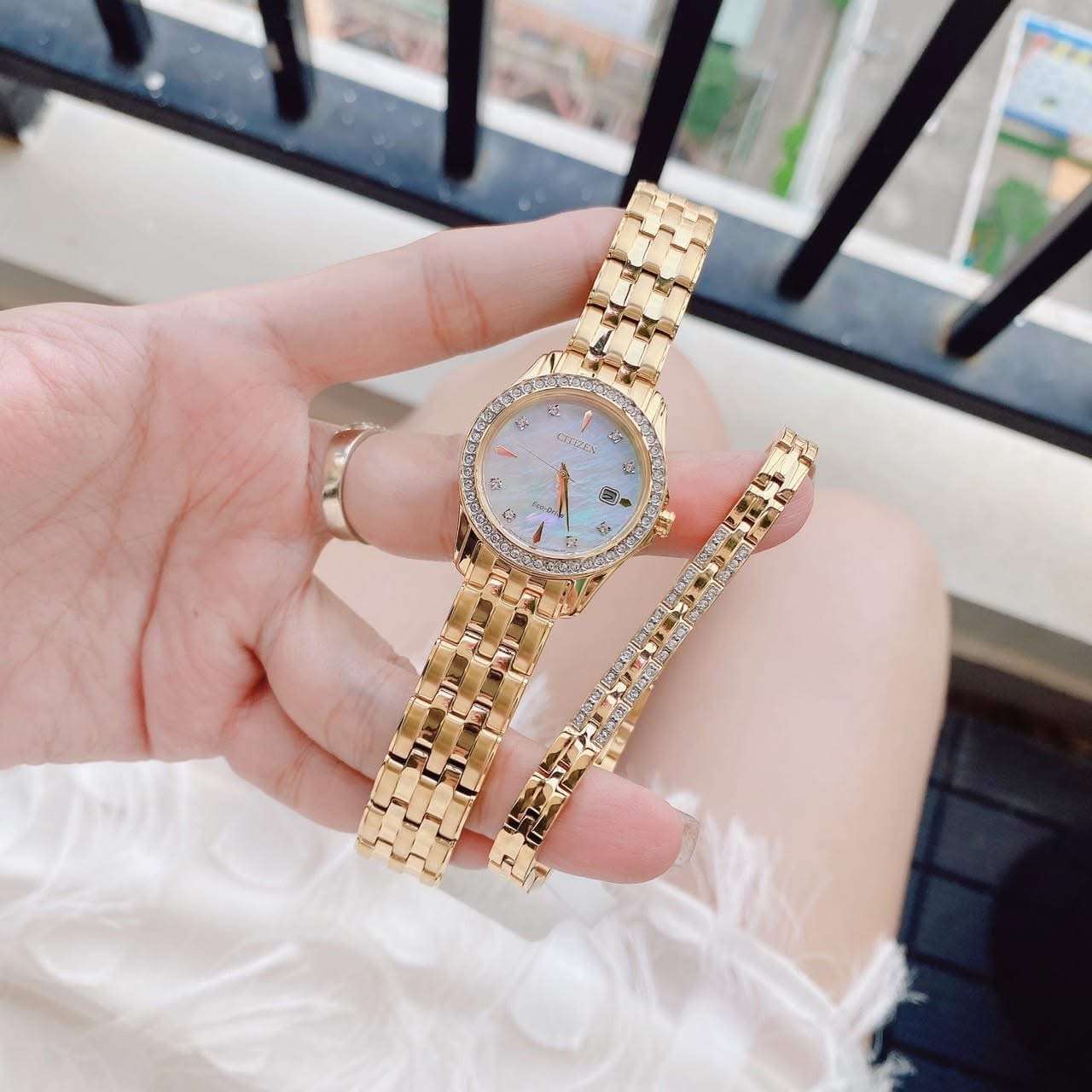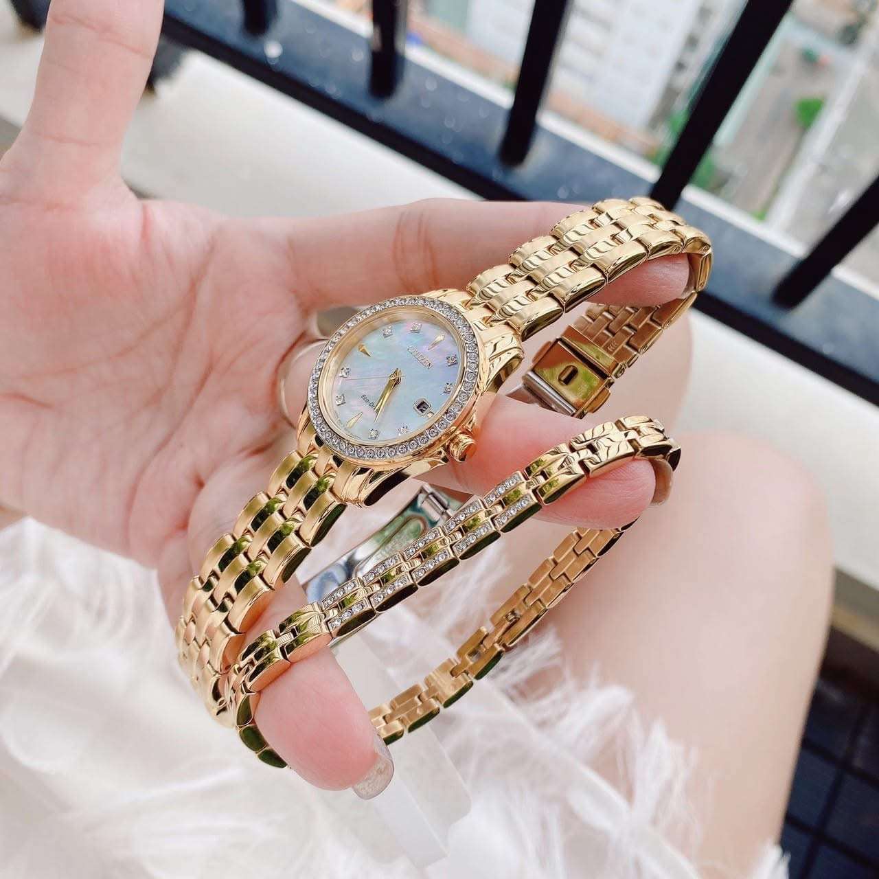 Đồng Hồ Nữ Citizen EW1907-78D Eco Drive Size 28 White MOP Gold Case Tặng Vòng