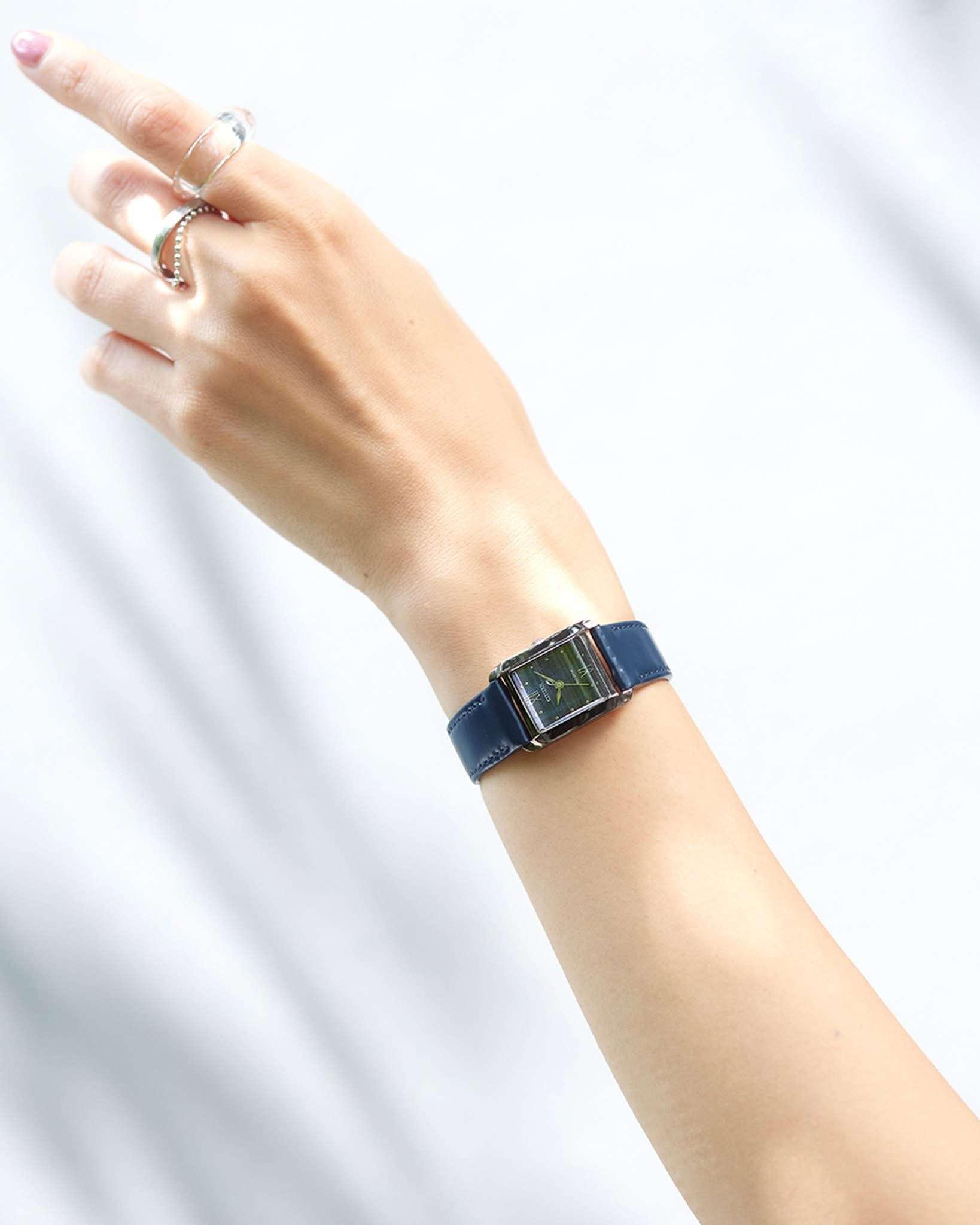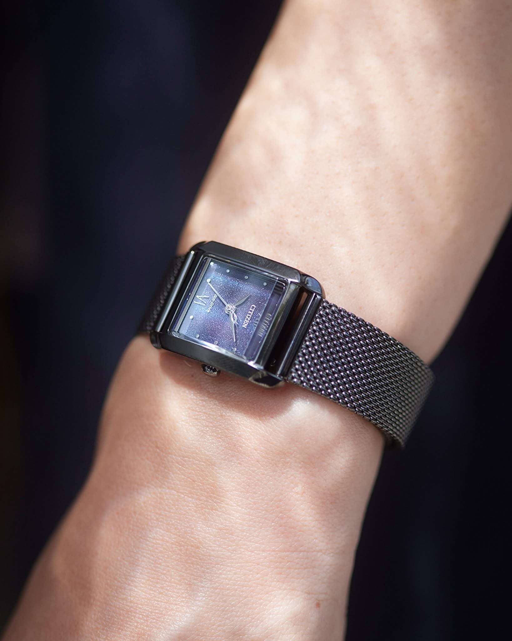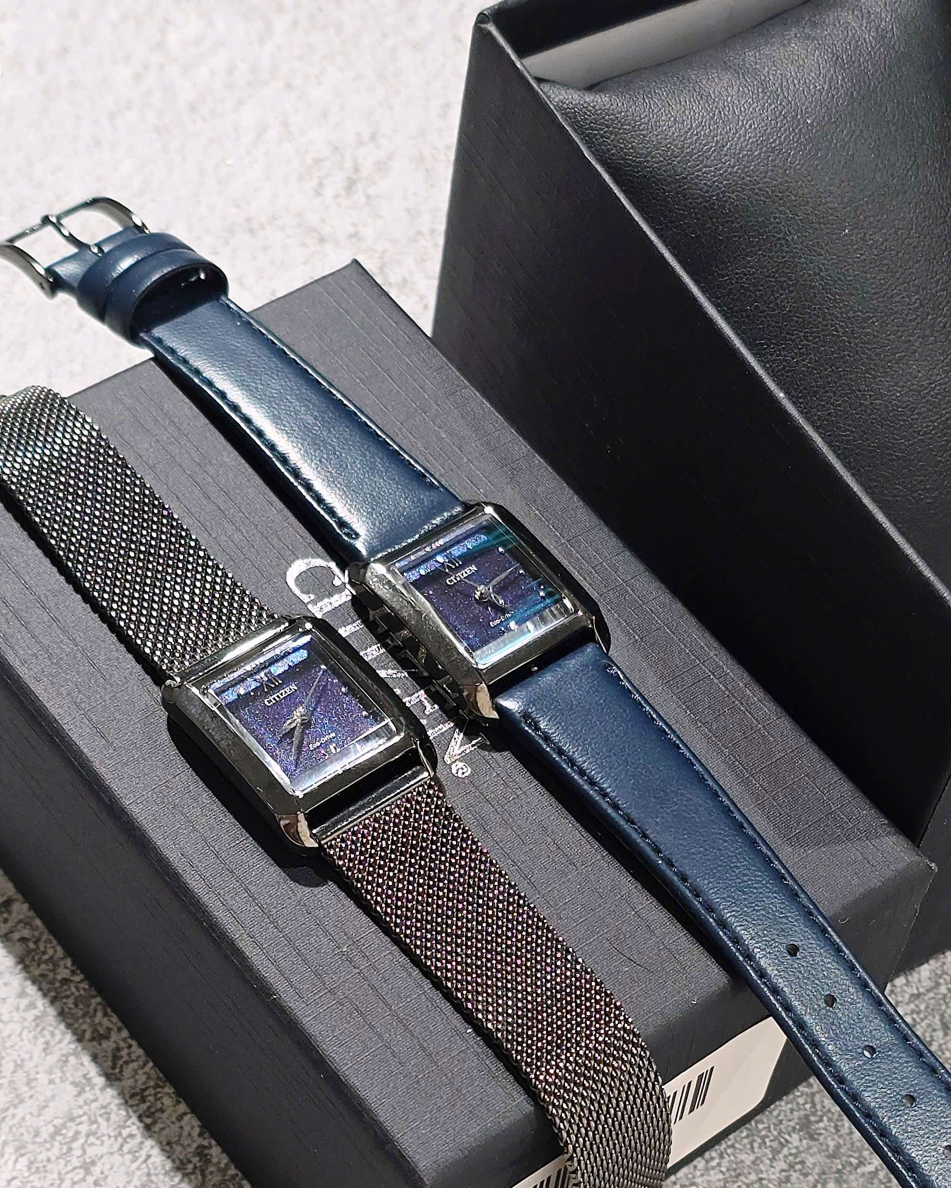 - Mặt đồng hồ vuông, nền xanh thẫm đầy bí ẩn, cùng các họa tiết mô phỏng ngàn ánh sao lấp lánh