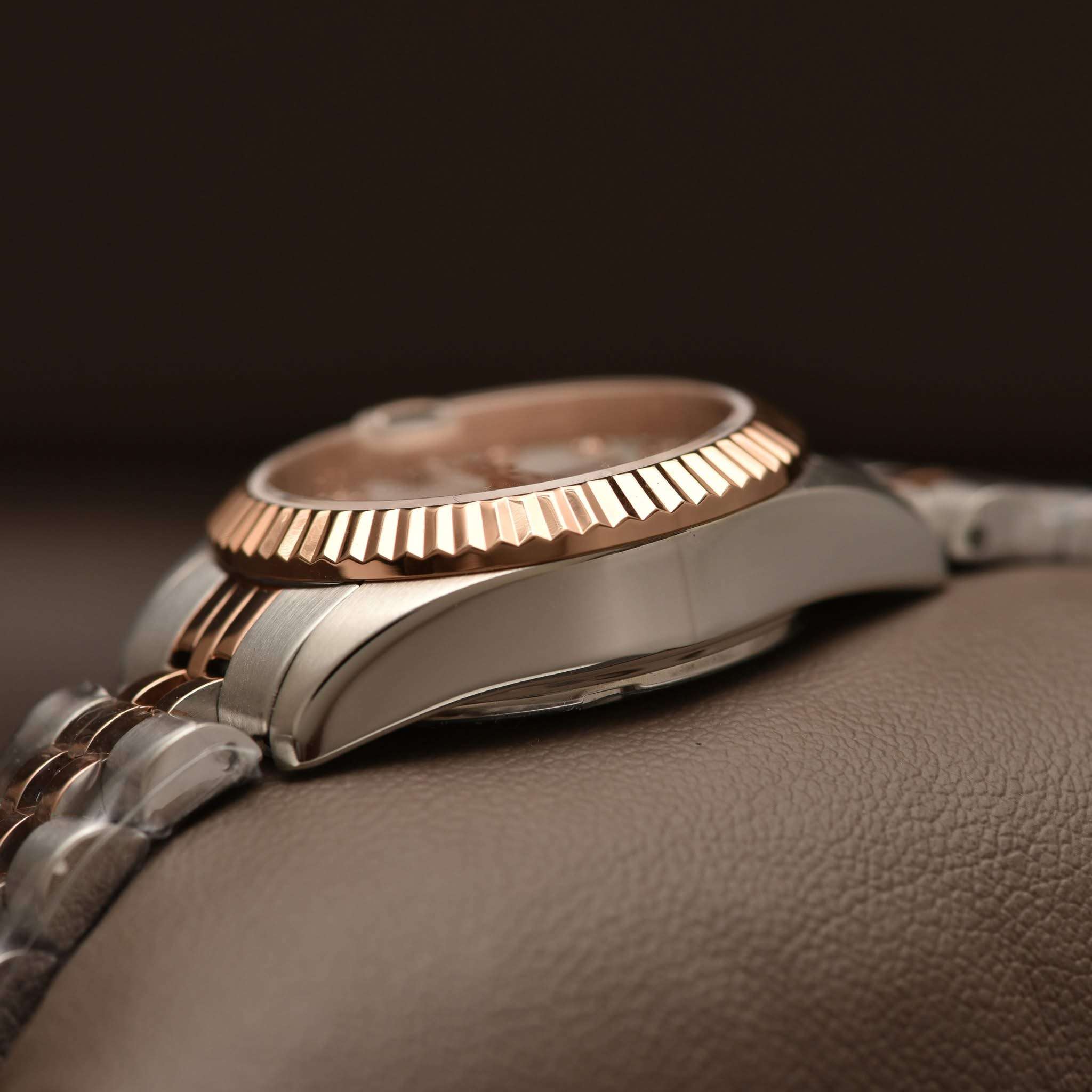 - *Vỏ:* Thép không gỉ kết hợp vòng bezel ánh vàng hồng sang trọng