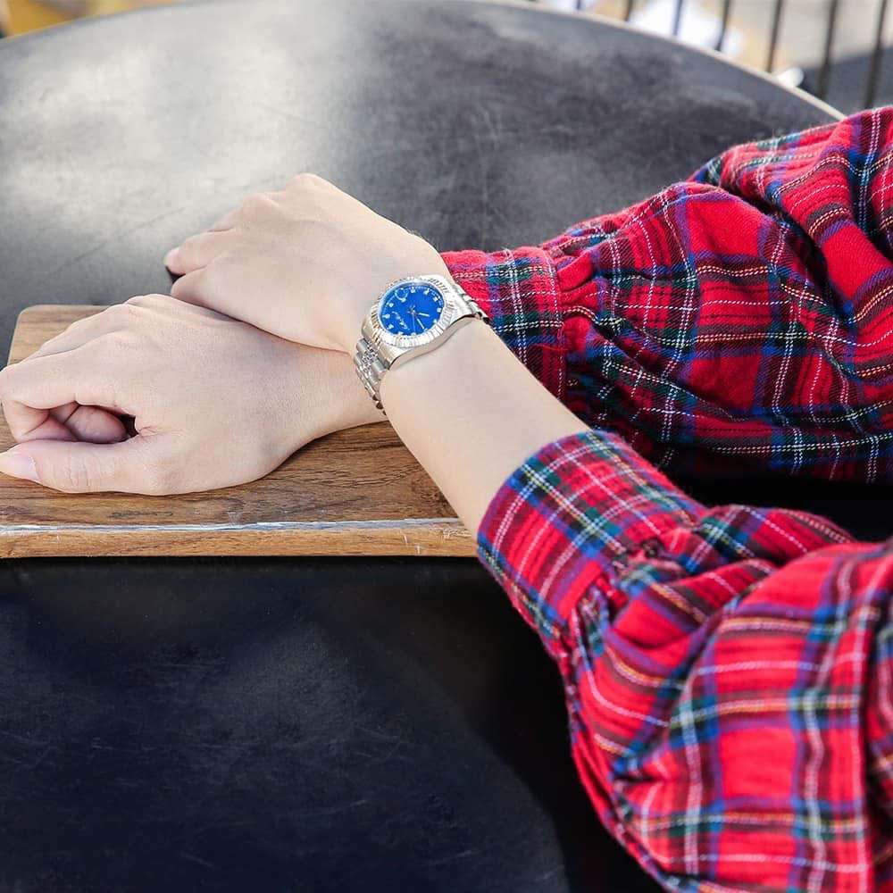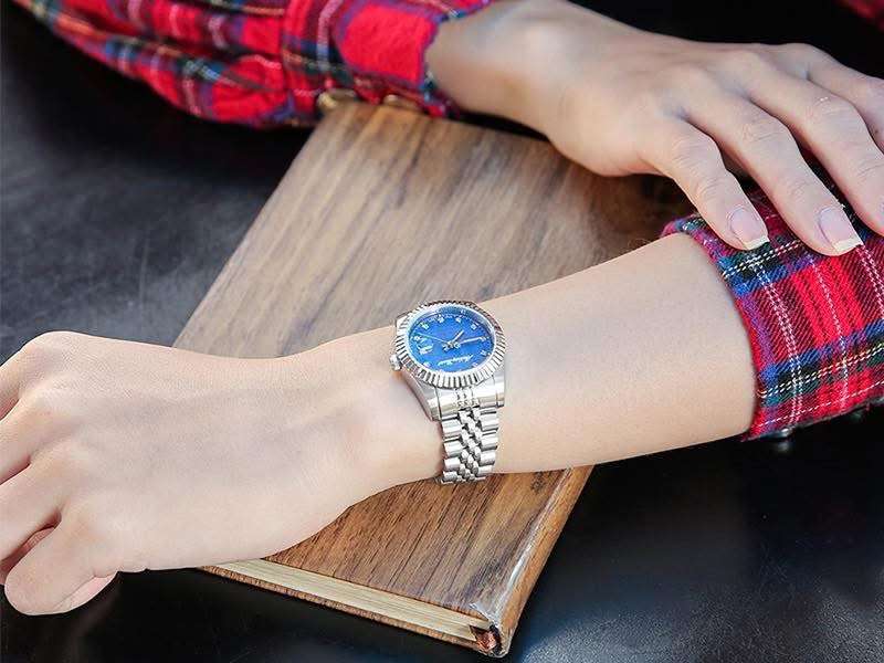 - *Mặt số:* Xanh dương, dấu giờ đính đá