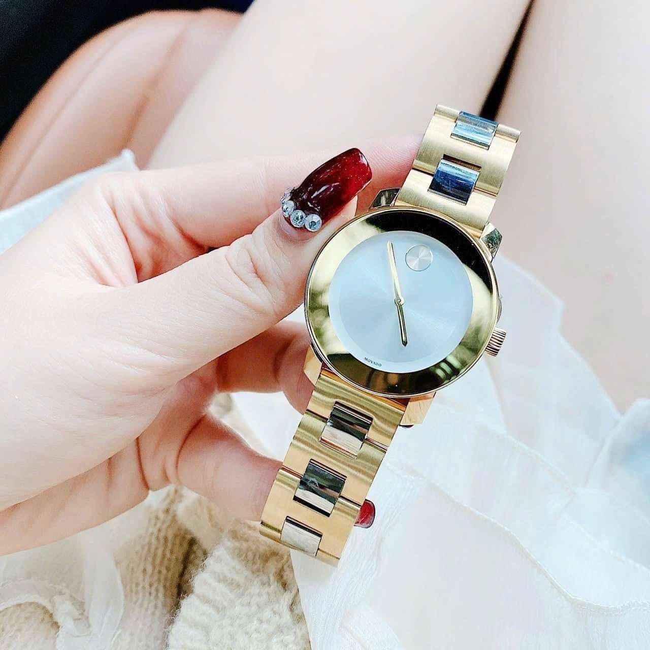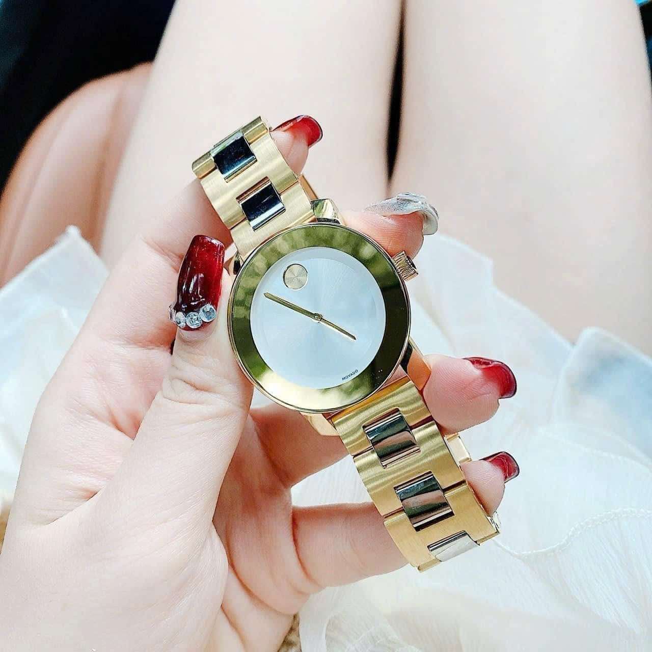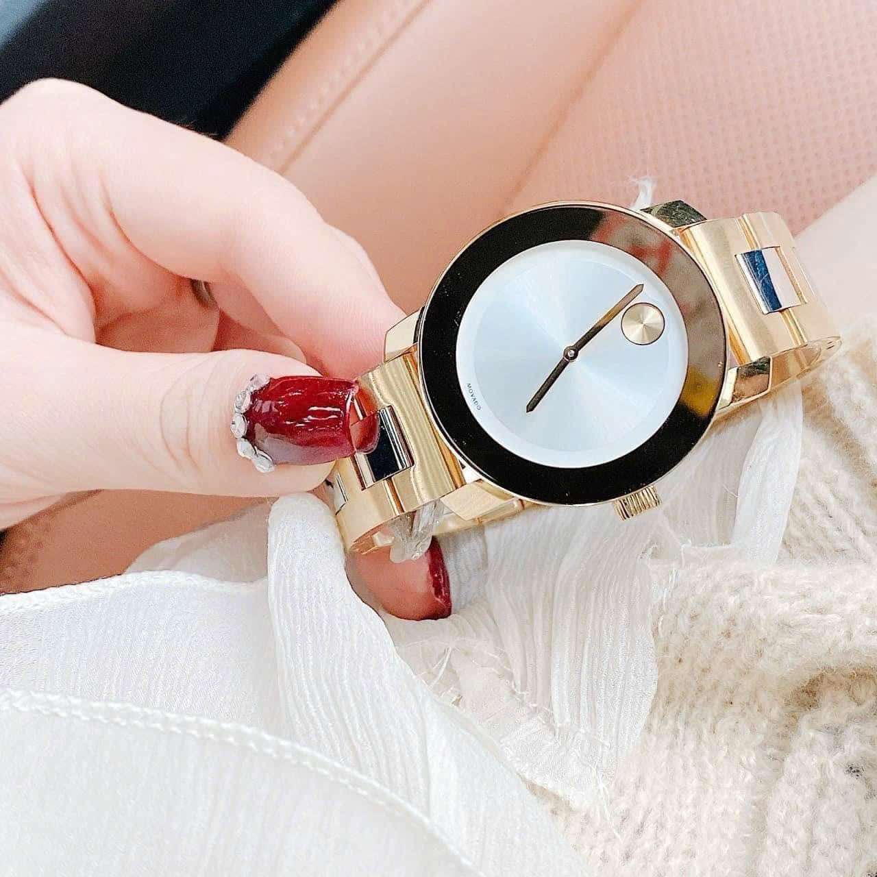 - *Thiết kế:* Chấm tròn đặc trưng của Movado tại vị trí 12h, mặt trắng với viền màu gold nổi bật
