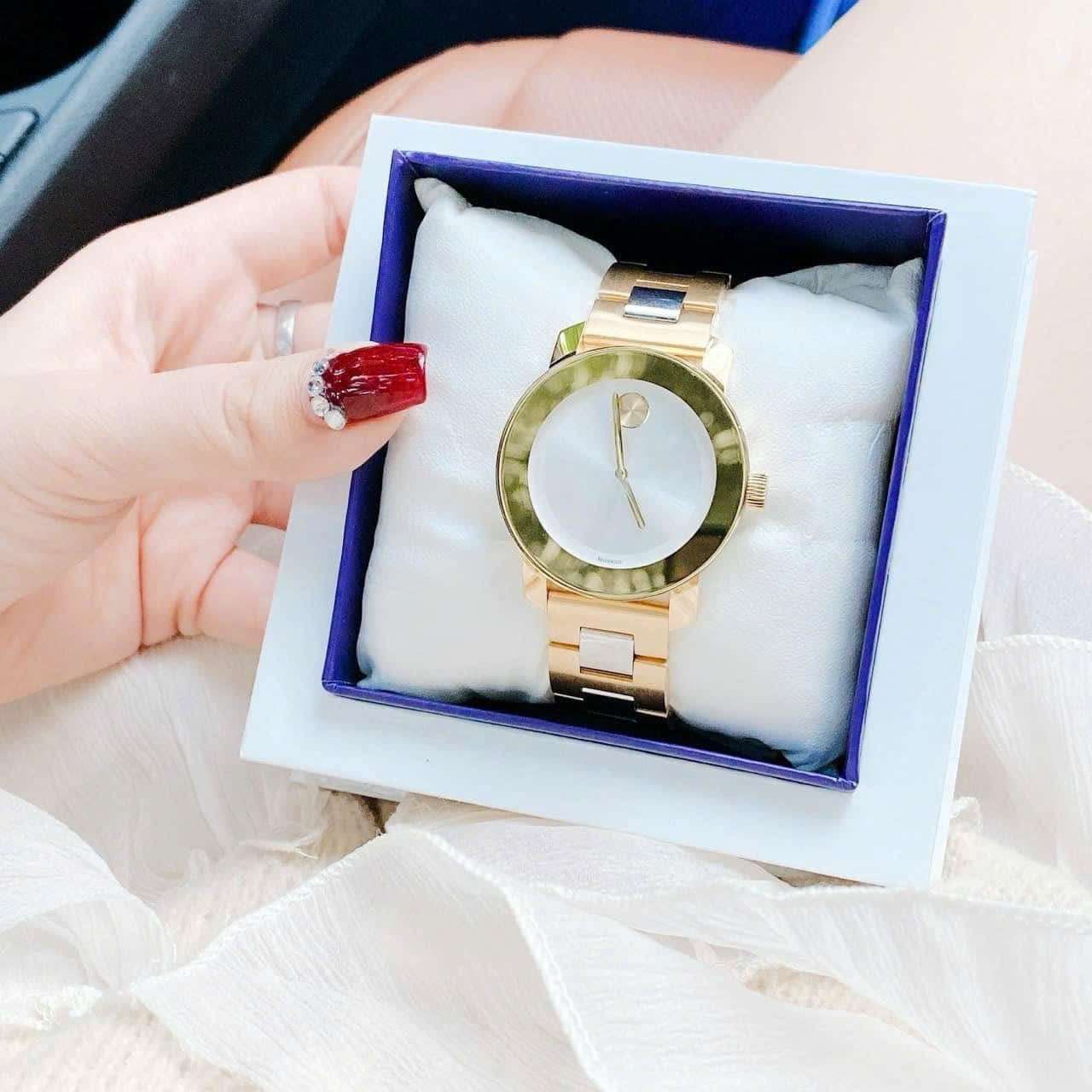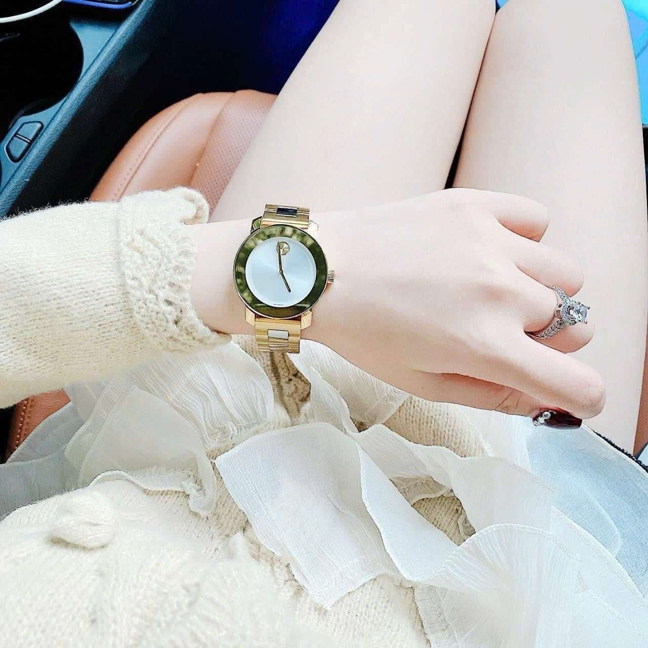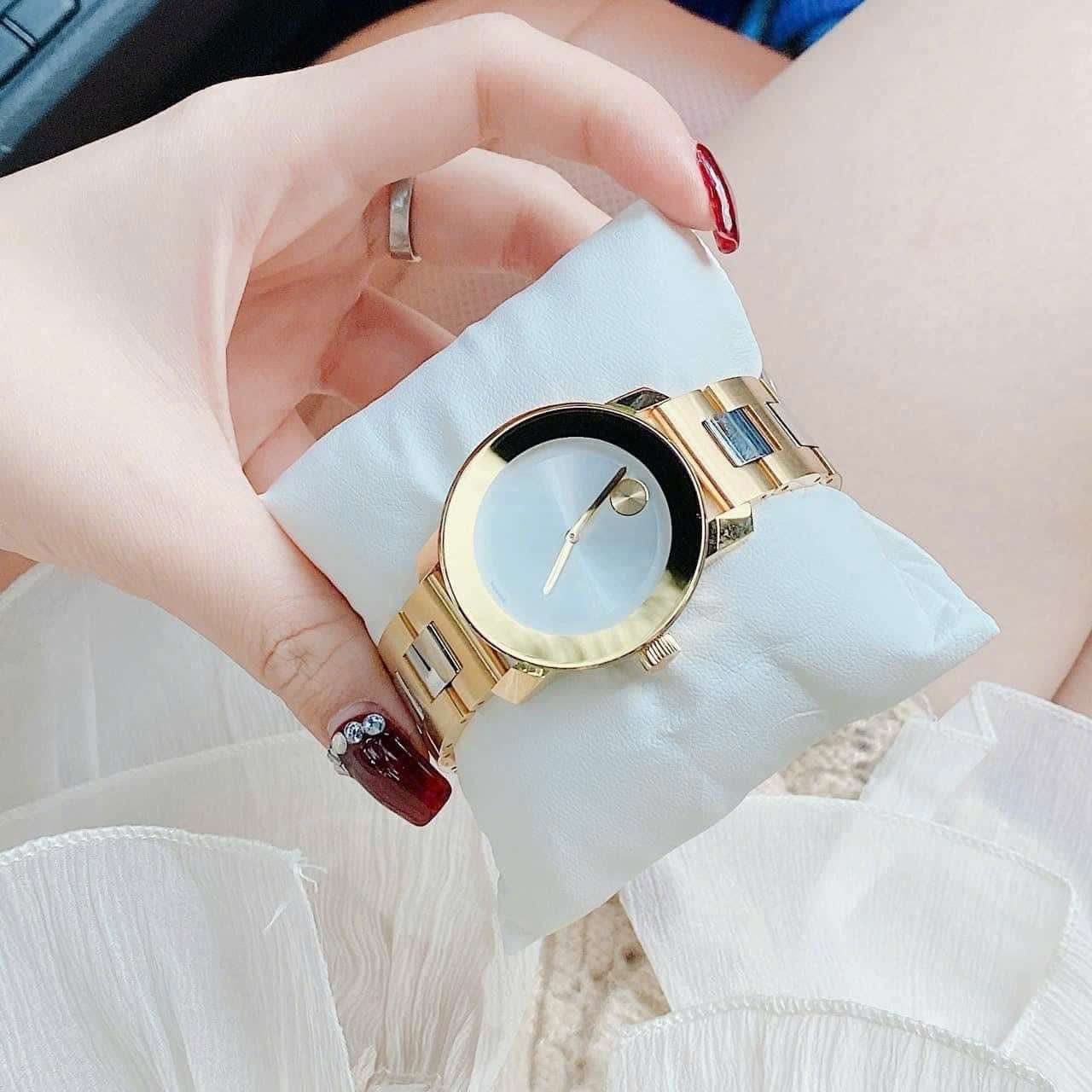 - *Thiết kế:* Chấm tròn đặc trưng của Movado tại vị trí 12h, mặt trắng với viền màu gold nổi bật