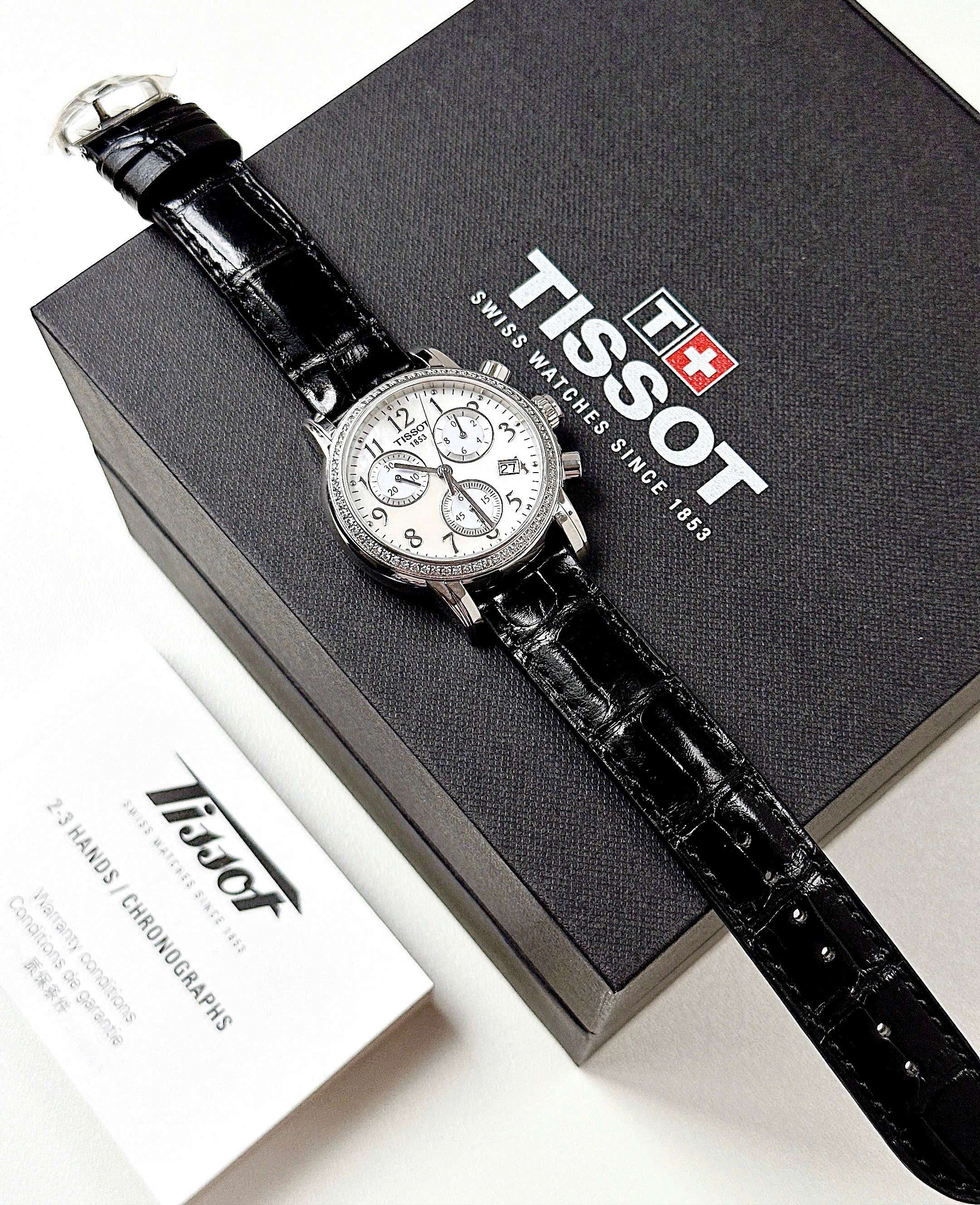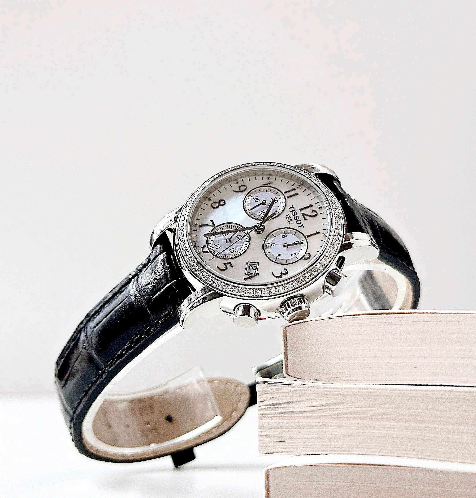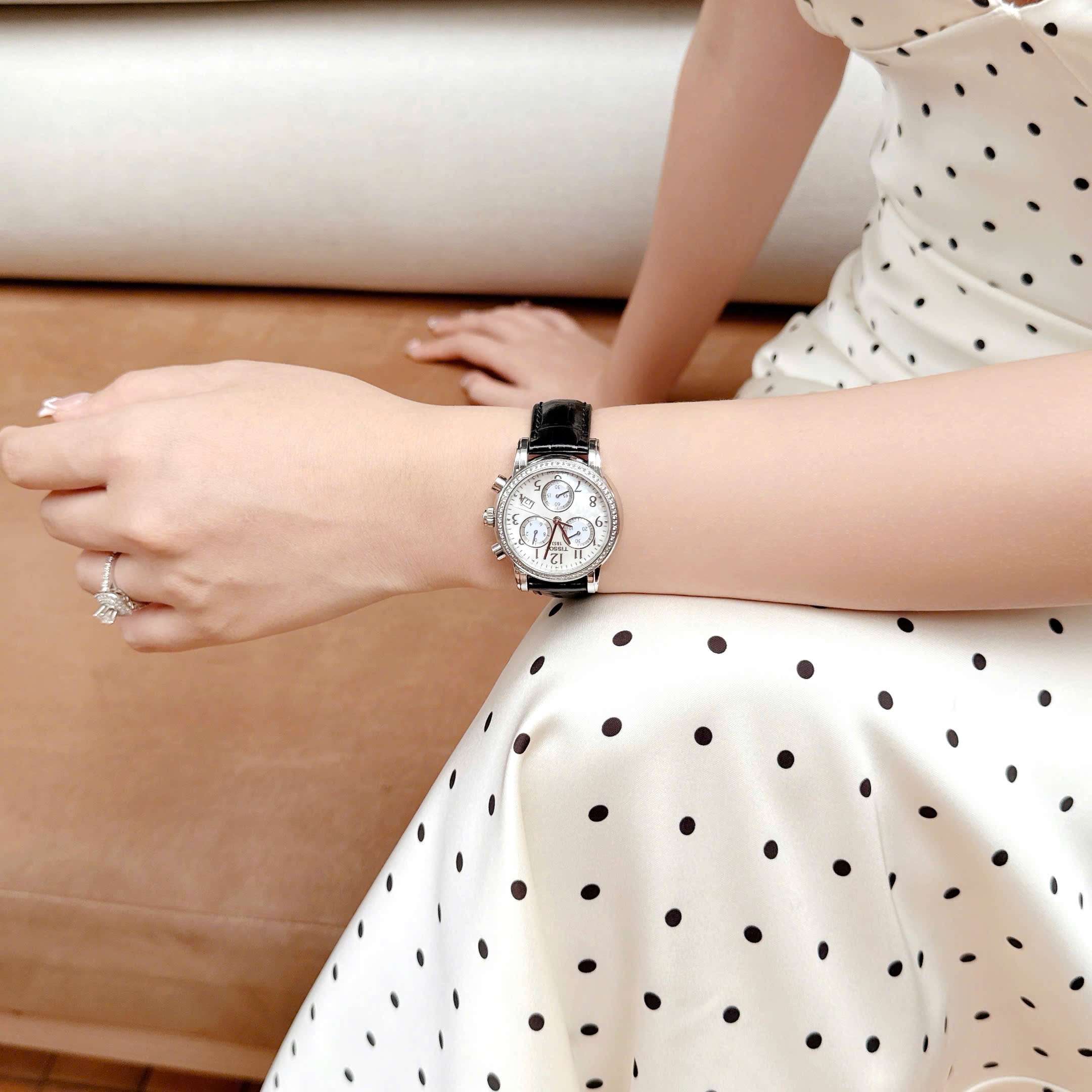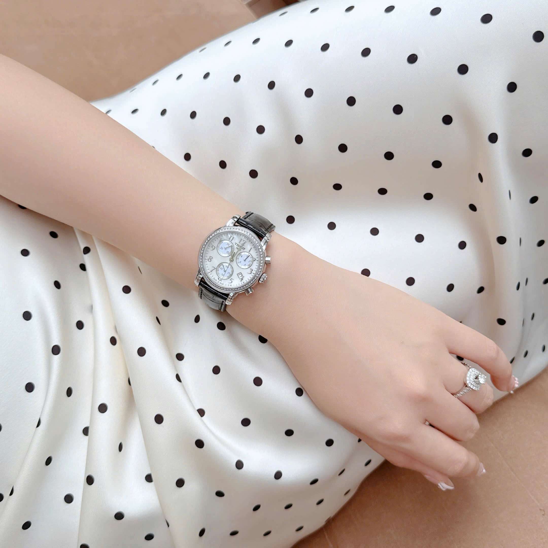 - Mặt số khảm trai thiên nhiên óng ánh, được điểm xuyết ba mặt số phụ thể thao cùng viền đính kim cương lấp lánh